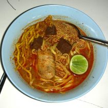 Think Chinese noodles with Lanna flavours, think green curry noodle soup, think cheese toppings…strange but surprisingly delicious.
