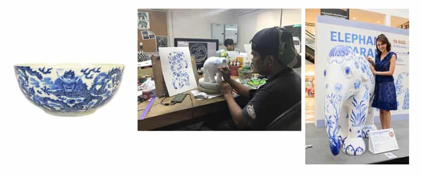 A recent partner of Elephant Parade was River City Bangkok, where the blue and white ceramic themed elephant called Nam was created. The elephant was made to celebrate the eclectic mix of antiques and gems from all around Asia, and the final design was based on traditional ceramics of the region. Elephant Parade’s in-house designers detailed the different parts of blue pottery to create a seamless, stunning blue and white elephant for the company.