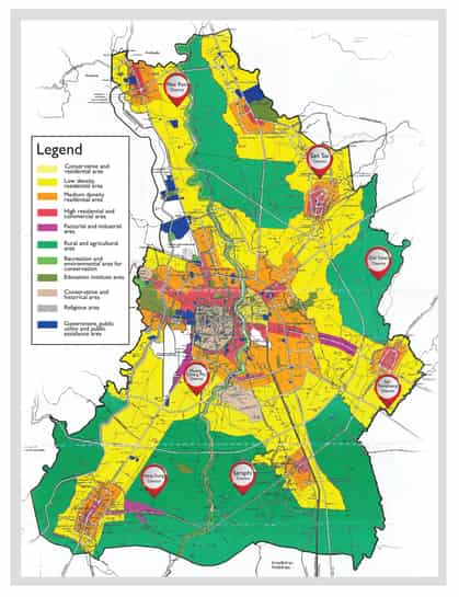 In 1984 the Ministry of Interior launched the first Chiang Mai City Planning, covering 100 sq km in Muang District, Mae Rim and San Sai. “The immediate effect was the population expansion outside the urban area, mainly along major highways, due to higher tax in the city,” explained Dr. Duangchan Aphawatcharut Charoenmuang, Social Research Institute, Chiang Mai University. “The problem was that these outlying residents still had to come into the city for work. So the first reform also pushed for controlled decentralisation from Chiang Mai municipality. Education and employment were dense in the city centre, while those in suburban areas had previously lacked economic growth, this was when the various districts began to administer their own budgets.”