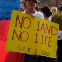 The “No Land No Life” slogan is part of a campaign by the human rights and environmental protection organisation Pan Asia Pacific. The mission of the campaign is to draw attention to the need for land reform and protection for small farmers from land-grabbing corporations. Because, as Choosri said, unequal land policies disproportionately impact rural women, a demand for land and resource protection is a central call at the march today.