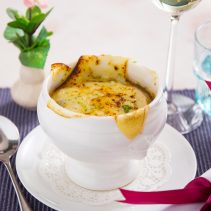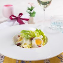 จานเรียกน้ำย่อย อาจเริ่มต้นด้วย ซีซ่าสลัด เมนูผักสดใบกรอบราดด้วยน้ำเดรสซิ่งสูตรโฮมเมด หรือ ซุปหอมใหญ่ฝรั่งเศสสุดคลาสสิค ท็อปด้วยชีสกอมเต้ ให้รสชาติหอมเข้มข้น