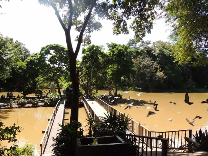 The emancipated figure represents Siddartha Gautama, the Buddha, before he attained enlightenment. Whilst roaming northern India, searching for the answer to happiness, Siddartha practised asceticism. He fasted until the brink of death, at which point he realised that starvation was not the way to enlightenment. This experience lead Siddartha to realise the power of practising the ‘Middle Way’, which is avoiding extreme habits – such as starvation or gluttony – and practising temperance. The boney statue was a hard-hitting reminder of this valuable teaching, shared by all schools of Buddhism. What sets Wat Umong apart from the other temples around Chiang Mai is its spectacular surroundings. Alongside the path, red vines caught my eye as they caught the sunlight, softly swinging in the hot breeze. The path lead me to a lake enveloped by greenery, whereby two wooden bridges connected me to a small island in the centre. A little boy threw food off the bridge to greedy catfish, which jumped so far out the water I thought he might catch one. On the other side of the island, circles were emerging on the surface of the water, rippling outwards. I crouched down to get a closer look, and saw the face of a tiny turtle coming up for air. Little turtle mouths popped up every few seconds, all around the lake. What an ideal place for a rest on a shaded marble bench, I thought, until my moment with nature was rudely interrupted by a bird pooing on my iPhone screen. I’d been too busy looking at the turtles to realise that there wasn’t an inch of tree branch above me unoccupied by a pigeon. It was time to go.