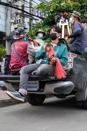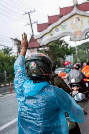 At the intersection at Tha Pae Gate, the soaked group veered onto Kotchasarn Road and around the moat they went. Like a merry-go-round, the carmob waved three-finger salutes and posters in the direction of anyone that was walking or driving by. First they demonstrated on the outer moat road, then the inner. Shop owners and restaurant employees cheered and saluted as the cars and motorbikes honked horns in rhythmic patterns. Tuk-tuk and songthaew drivers joined in as they packed their vehicles with drenched activists. The showers continued but did little to thwart the mob’s energy.