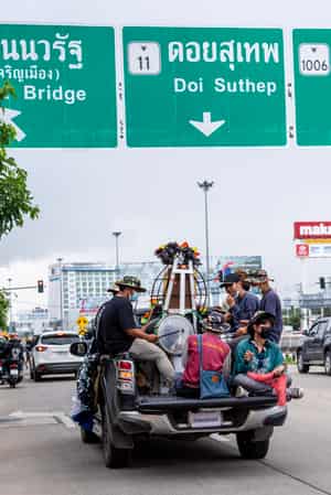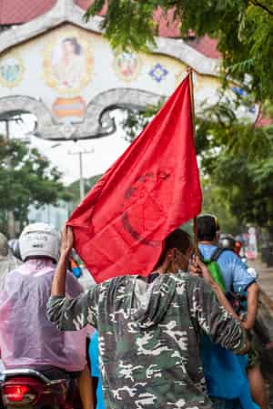 “Today my flag says ‘Freedom for all Thai people’ on it”, said 45 year old protester Mina. Mina has been living and working in the Saraphi District of Chiang Mai for three years, “I heard about the protest from Facebook and friends.” She was wearing a mask and dressed in all black. Along with most of the vehicles in attendance, her license plate was covered with a small handmade sign to further conceal her and her family’s identity. When asked about the organiser of the event Mina as well as other attendees wouldn’t comment. While the majority of protests over the past year have been organised by local activist and student groups such as Wilar Party and Community of MorChor, today’s protest was more enigmatic. Protestors said rising police investigations are the reason for keeping such a low profile.