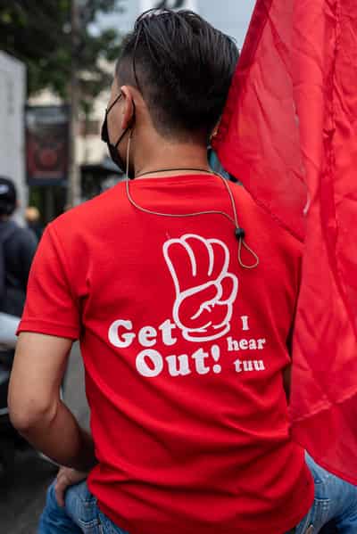 “We want Prayut out,” said Mina, “He cannot organise and give the people of Thailand what they want. The people in Thailand do not have access to a vaccine and I don’t understand why. We want AstraZeneca and Pfizer now!”