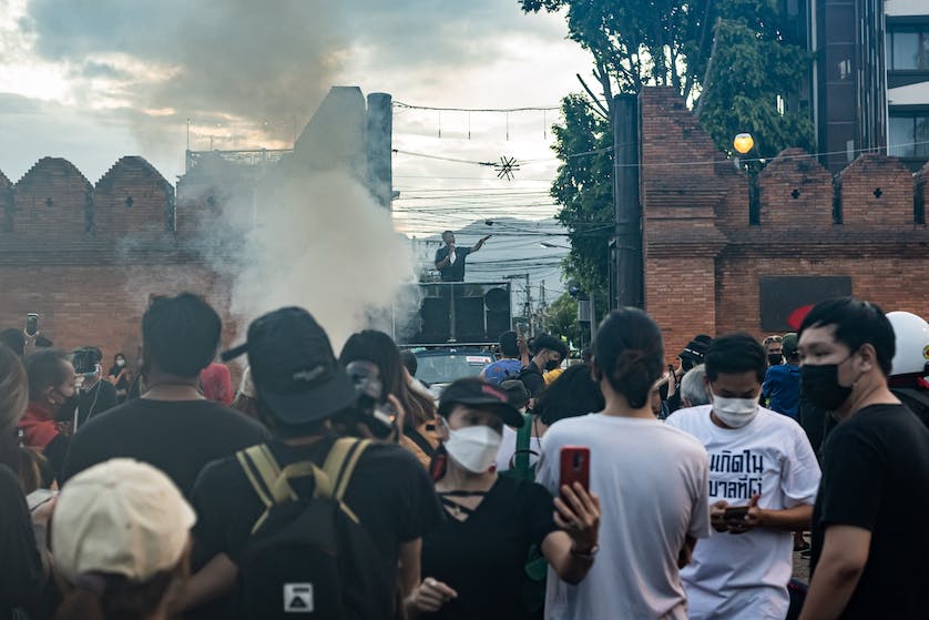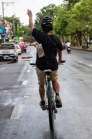 As they turned left on Charoen Muang Road and made their way over Nawarat Bridge, the rain began. A light sprinkle turned into a heavy shower; the protestors couldn’t care less. Motorbike drivers pulled over to throw on raincoats. The mob paused on the bridge to make sure everyone attending was protected from the rainfall. The ink on their cardboard signs began to run and yet demonstrators were all smiles. They carried on toward Tha Pae Gate.