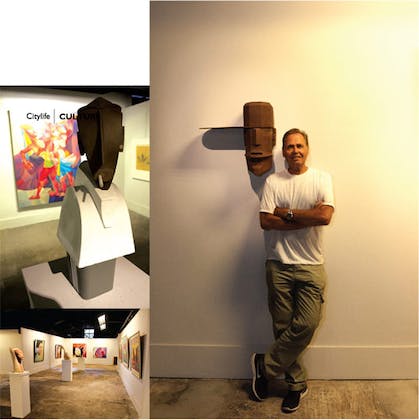 His collection of “cyberheadz”, comprises sculptures from teak powder, fibre glass, clay and redwood. Some are Egyptian inspired such as “Mayfretete”, named in homage of his muse Maytaya (and once referred to by a fellow artist as a combination of Nefertiti and Avatar!), others come straight from Hollywood, such as the adorably tongue-in-cheek “Hollywood Actor (Retired)”, which is an image of what Mickey Mouse would look like today at age 86 and a quirky creation fusing Frankenstein and Arnold Schwarzenegger “The Terminegger” (complete with an option for steam-release bolts by the side of the head so incense [when incensed] lit from within, can release its smoke in quite a dramatic manner).