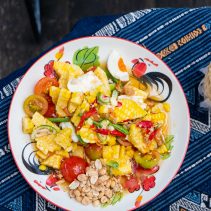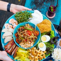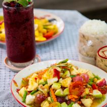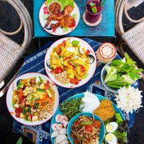 Somtam tastes good whether you are sitting on a picnic table by a waterfall or on a plastic stool by the roadside. But if you are looking for a bit of comfort in a cosy garden setting, then check out this charming little venue where you can order a cup of coffee, a spicy som tam, a rich chocolate cake as well as an assortment of Isaan favourites in a arden restaurant surrounded by flowers and ponds featuring pretty lotus flowers. Recommended dishes are the tam taad, a somtam dish served on a large traditional tray filled with delicious accoutrements: noodles, pork neck, shrimps, vegetables, boiled eggs, etc. The salted egg corn salad is another interesting dish filled with bold flavours and the spicy fruit salad is perfect for health lovers. End the meal with a refreshing berry smoothie. Somtan Udon soi Tantawan by Prodoi Café 182 Moo 11, Chiang Mai-Phrao Road, T. Nong Harn, A. San Sai Open 10am – 8pm Tel. 095 134 7859 Facebook: ส้มตำอุดรซอยทานตะวันbyบ้านผ่อดอย