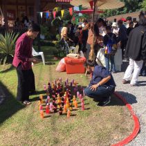 In the morning, as the soft rays of sun shone on the charming old train station, a group of Lanna dancers performed a cultural show for us before ringing the brass bell, signaling our departure. The train began its painful pull out of the station at 9.15am from Chiang Mai Railway Station heading towards Tha Chomphu Railway Station in Lamphun. As we were gently swayed from side to side on the comfortable new seats, we were entertained by a live band singing ye olde songs and cowboy country music. The organisers had us playing bingo and quoits and we were given some old fashioned toys to play with as we chugged along towards Lamphun where we stopped for a visit at the iconic Tha Chomphu Bridge and enjoyed eating local snacks at Kad Mua Market. Continuing on, we arrived at Khun Tan Railway Station for lunch, taking lots of pictures, before stopping off at Lampang station for a brief spell.