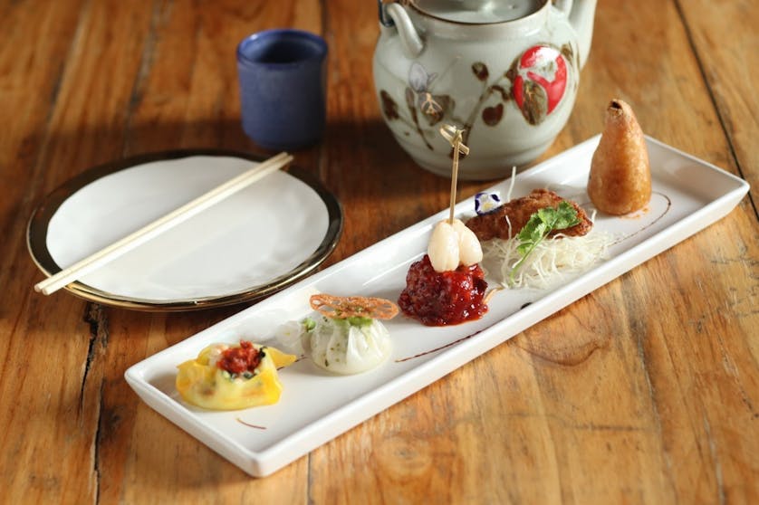 Try the menu highlight, the taro-roasted chicken where chicken skin is air-dried for four hours before being roasted with taro and fried, served with the special house sauce, a unique dish you won’t find anywhere else in the city. There is also a tasty sampler of creative and innovative dim sums you can order, with four different dim sums served up on one dish, making for a fun dining experience. The fried rice with double egg served in a charming bamboo tube and the pan fried chives cakes are both highly recommended.