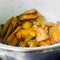 But we will share the fact that as a food lover Bussakorn, who moved to Chiang Mai from Bangkok ten years ago, was thrilled to have discovered a bushel of taro stems being sold in a local market recently. She immediately remembered a long forgotten family dish her grandmother used to make for her; pickled taro stem soup. After much asking around she couldn’t find anyone in her family who could remember how to pickle a taro stem as there are drying and pickling processes which were lost to time.