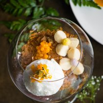 Thai Red Ruby: A modern Thai dessert which tastes like the famous ruby water chestnuts dessert, but is taken to another level with the addition of coconut ice cream and star gooseberry sweet caviar, and a crispy coconut crepe and Thai shortbread cookies on the side. The dish is candle-smoked pre-serving, to add to the flourish. The Redbox Restaurant No. 6, Haew Kaew Road Open 11.30am – 10.00pm (Close every Tuesday) Tel. 092 979 4542 Facebook: redboxdining