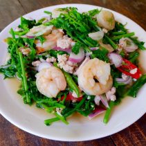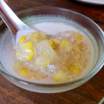 Now, onto the main dishes. Start off with the, spicy and sour Gang som soup, but with an interesting twist. The “Gang Som Pluek Tangmo” is a spicy soup that adds watermelon peel to its fish and vegetables. Next, I tried the Thai style fern paco salad with shrimps, using the freshly picked fern from the garden. I then tried the deep fried fish with a crispy golden crust which breaks in a crunch under your fork. This is served with sweet and sour sauce. The last main dish is an old-fashioned dish that never goes out of style; Mhee Kra Ti, a white noodle with a minced pork flavourful soup that is made from spices and coconut milk. Last but not least, a Thai dessert for the end of the meal is worth all the calories! Kao Niew Piak Kao Poad, a decadent boiled sticky rice with sweet corn and coconut cream.