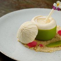 Complementing the meal with her culinary prowess, the dessert menu by Executive Pastry Chef Yanisa Wiangnon offers a burst of flavours of Thailand’s seasonal fruits. “Khao Niew Pieck Lam Yai is my recommendation,” says Ni Putu Jeniari, “A black sticky-rice pudding, served with fresh longan, young coconut, and crunchy coconut chips!”
