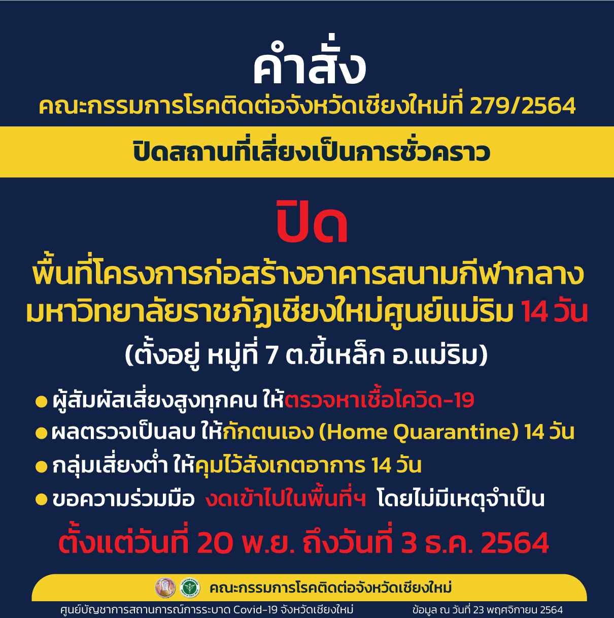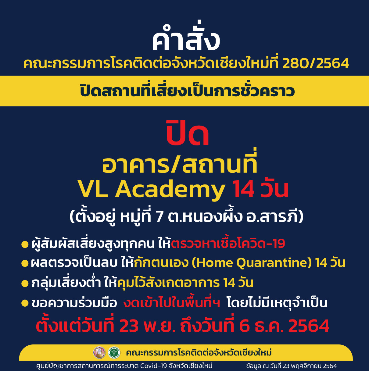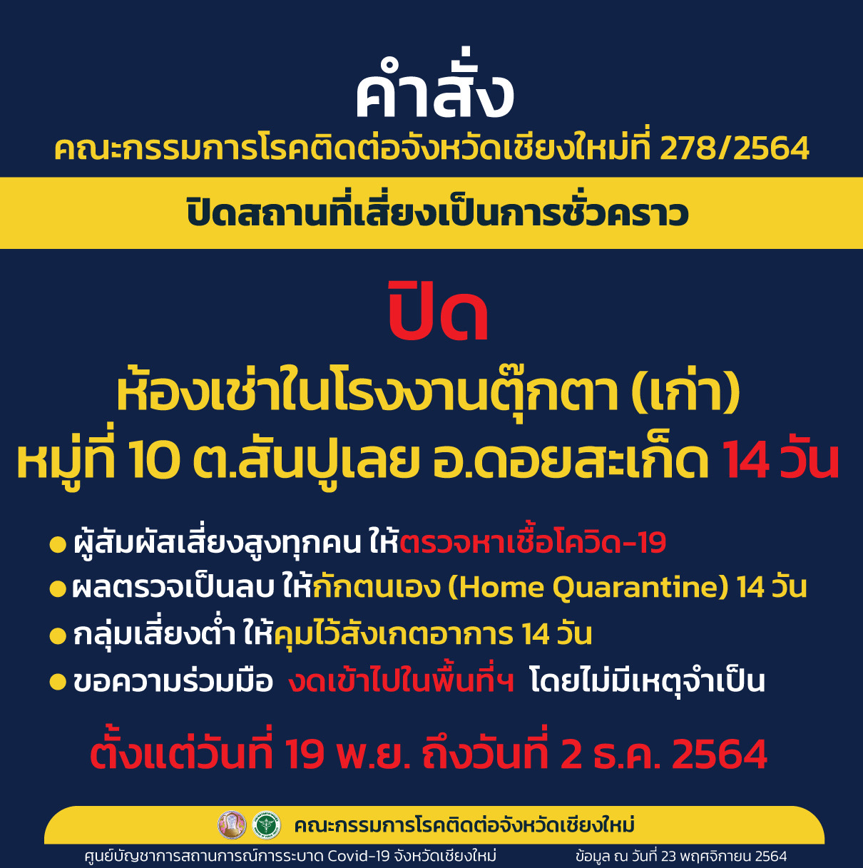 Dorms in a doll factory in Doi Saket’s San Pu Loei sub district will be closed until the 2nd December, a cluster of buildings in Rachabhat’s Mae Rim campus will bev closed until the 3rd December, and VL Academy in Saraphi’s Nong Pheung sub district will be closed until the 6th December.