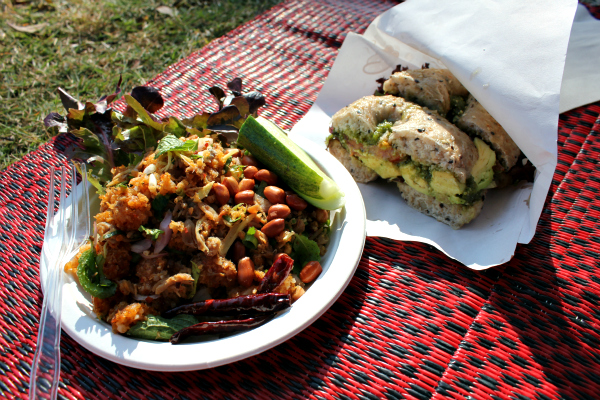 A Thai spicy mushroom and peanut salad along with a Bird’s Nest bagel.