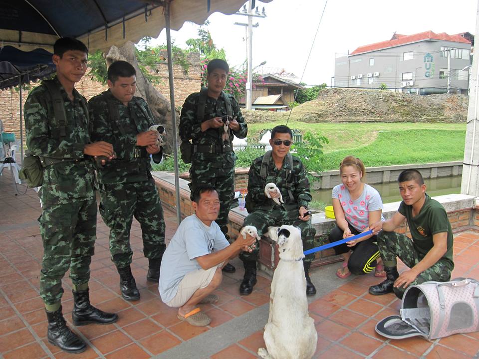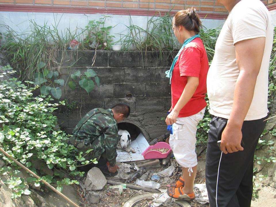 Hanging up the phone, Jum immediately headed to the moat to meet Job and Phet, and to assess the situation. Indeed, the pups were at risk. Luckily, Jum had arrived in time, and with help from Thai soldiers at the local base camp, they were able to save all six dogs.