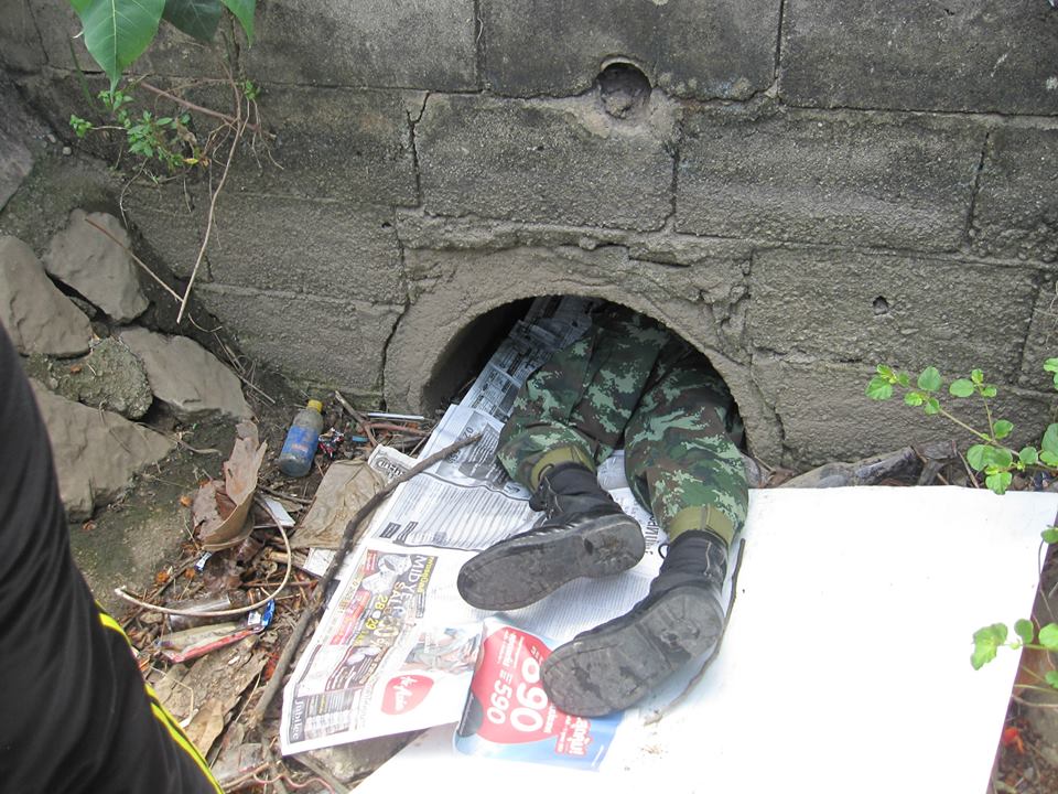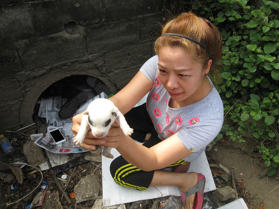 The story began yesterday, when Care For Dogs volunteer Jum received a call from two concerned Chiang Mai residents named Job and Phet. The pair had found a mother dog and her five tiny puppies living inside a drain at the moat in Chang Phuak. They were worried, because soon the water would be released into the moat, which could result in drowning for the puppies, still too young to swim.