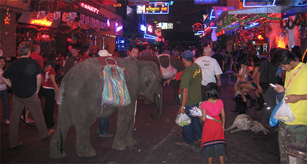 “The bars are half-full with the previous night’s now ludicrously drunk drunks. There’s a slightly unstable carnival atmosphere. Bangla Circus: where the acts spill into the audience. Sober people walk up and down the road watched by the funny exotic animals, roadside attractions inside their Happy Bars. Some of the performers paint their grave faces, readying themselves for another night on the tiles, making money, getting by. If they’re lucky in the morning they’ll hobble home on scuffed high-heels with some cash to send back to a poor bastard and his gran in Issan. Thailand’s burlesque holiday paradise, ageless under neon lights – will it ever get old?”