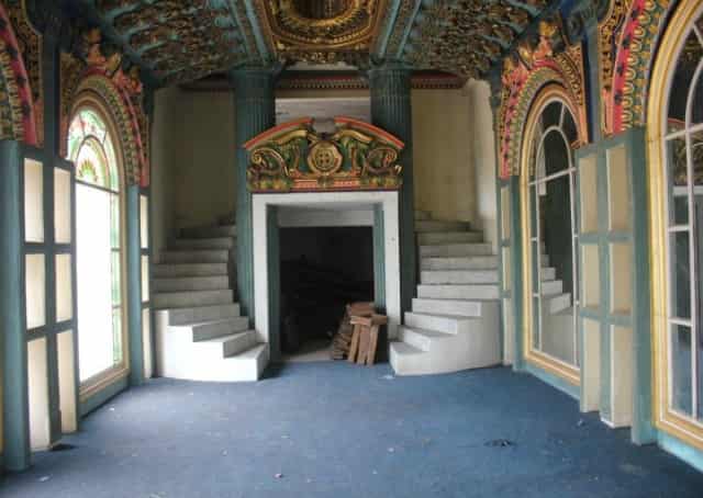 Upon arrival, I was greeted by ominous statues of roaring white lions and two buildings, one behind the other. I decided to try the smaller one first. The entrance had more lions, as well as beautiful granite statues of what looked like Greek gods. As inauspicious as it looked, the top of the house said “House of Success.” Sort of ironic given what supposedly happened here, eh? There was no “real” security on the house save for some loose wiring keeping the front doors shut. I opened it and was greeted by a cathedral-like setting.