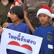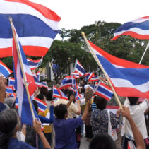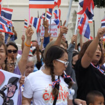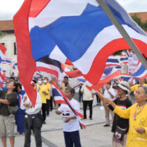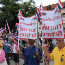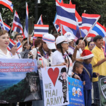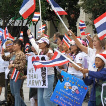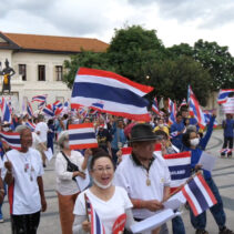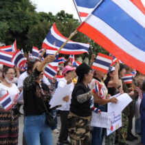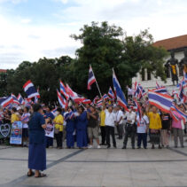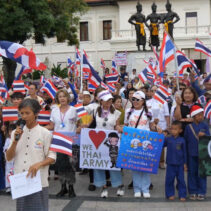 Under the banner of, “Together we love Thailand”, the protesters carried Thai flags, and signs, while singing the national anthem as well as other rousing national songs.