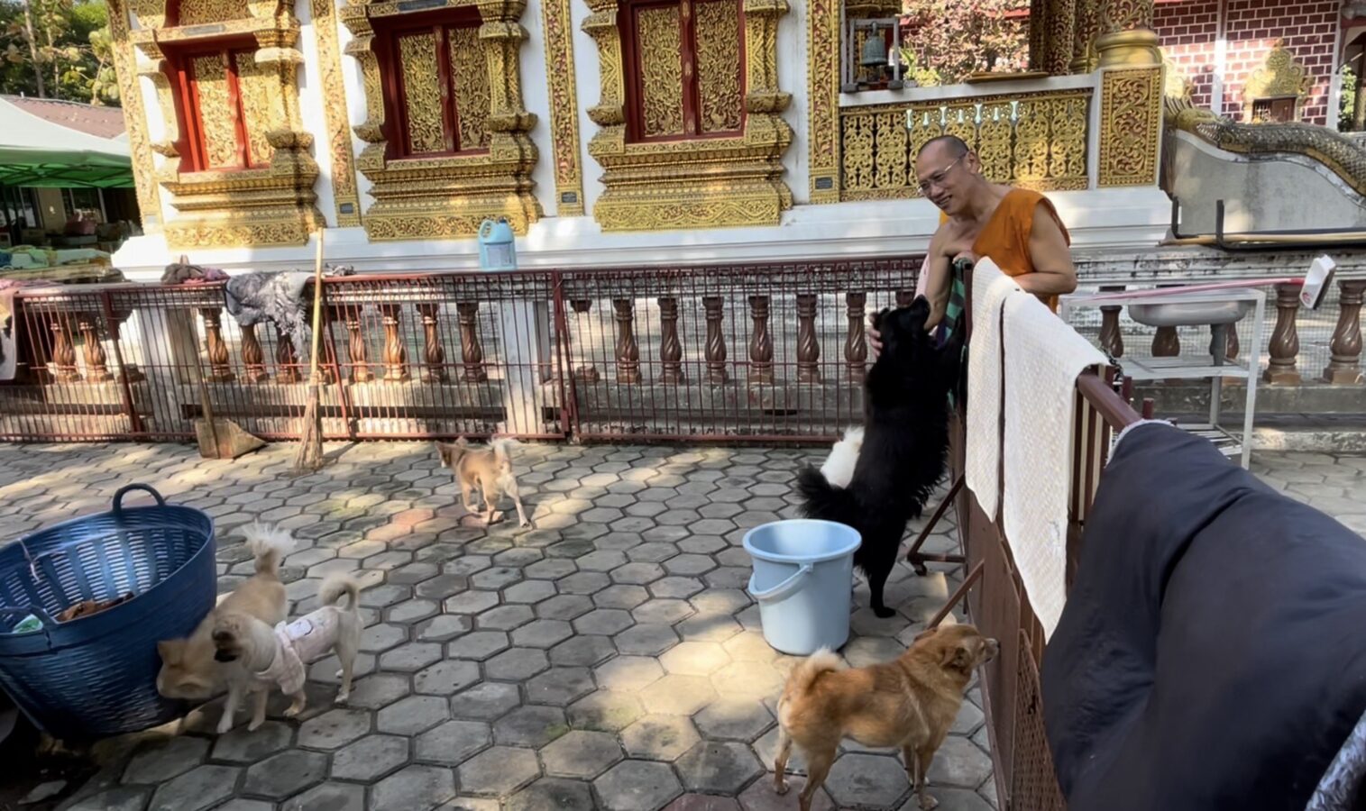 At Wat Mae Yuak in Chang Phueak, compassion comes with four legs. Behind the temple walls live more than 300 dogs—small, large, pedigree and local mixes—most of them abandoned, many literally dropped off in cages or cardboard boxes. Alongside them are nearly 90 cats, all now under the care of the temple.