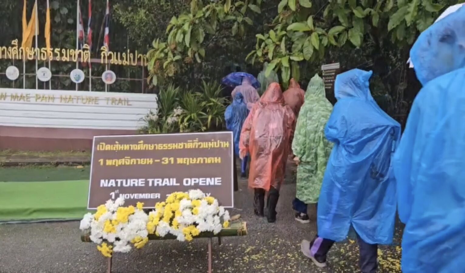 In spite of the season’s last surprise heavy rains and fog which covered Doi Inthanon this morning, visitors still arrived for the reopening of the Kew Mae Pan Nature Trail, closed for five months for ecological recovery. The trail officially reopened under the direction of Kritsiyam Kongsatri, head of the 16th Office of Protected Area Management.