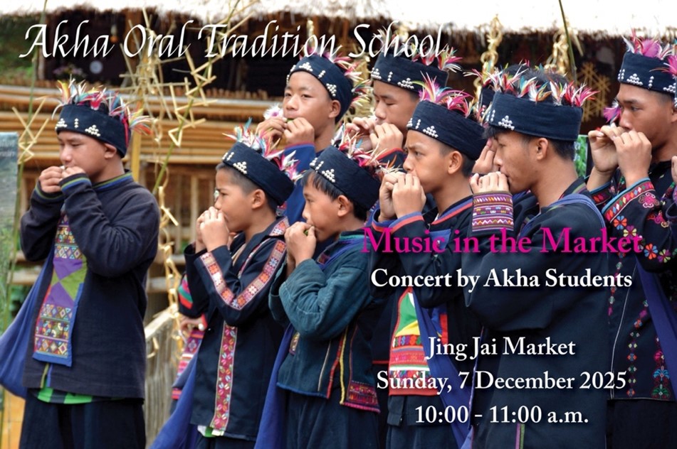 On Sunday morning, 7th December, from 10 to 11 am, Akha youth from the Akha Oral Tradition School will share their music with visitors to the bustling Jing Jai Market, a colorful weekend hotspot that features creative local crafts, art, eateries, and cafés.
