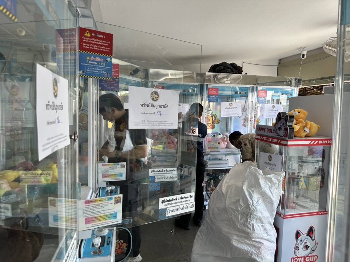 Officers asked the operator to demonstrate how the claw machines worked. When the button was pressed, the clamping system activated but failed to grab a doll. There was no automatic refund system or QR code available for a refund. All other machines operated in the same manner. These claw machines are allegedly deceptive, as the odds of winning a doll are unacceptably low. The machines were being operated without proper authorization and may be considered as gambling devices under Thai law.