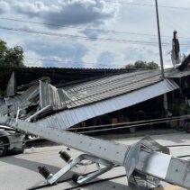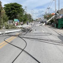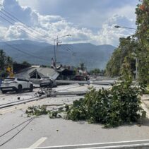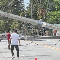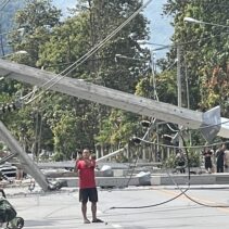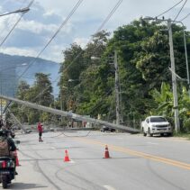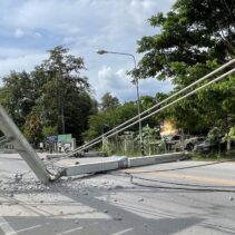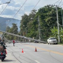A pickup truck accident occurred when it lost control and crashed into a roadside electric pole in front of Him Kong Restaurant on Nong Ho Road in Chang Phueak, causing over 10 large high-voltage power poles to collapse across nearly one kilometer. The fallen poles damaged nearby houses and shops and blocked traffic. A fire also broke out at Him Kong Restaurant shortly after the crash.