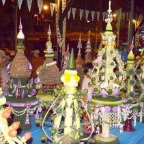 This tradition of making sand pagodas during the Songkran New Year dates back centuries. The sand is built to give to temples as an offering for all of the grains of sands trekked out of temples under our feet over the past year. These impermanent saint pagodas are elaborately decorated.
