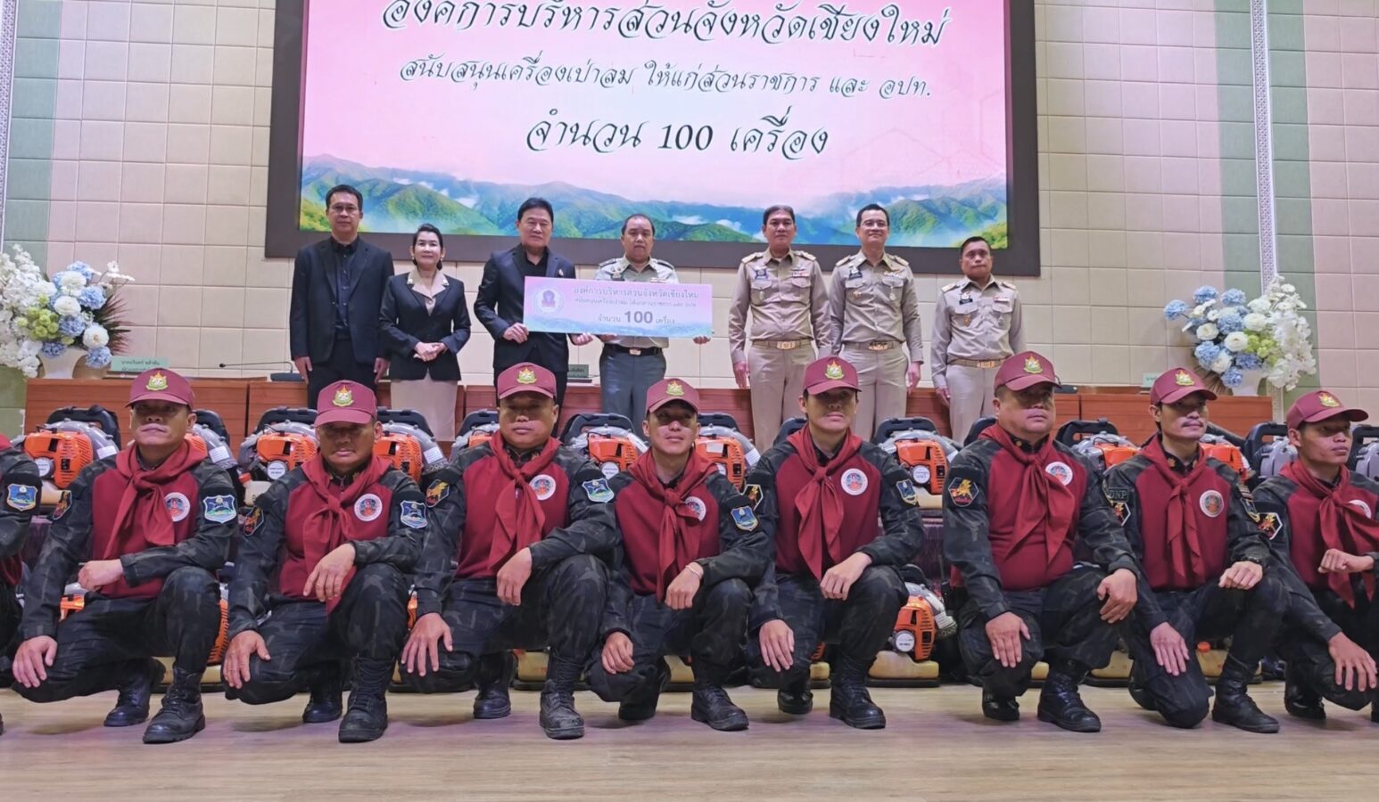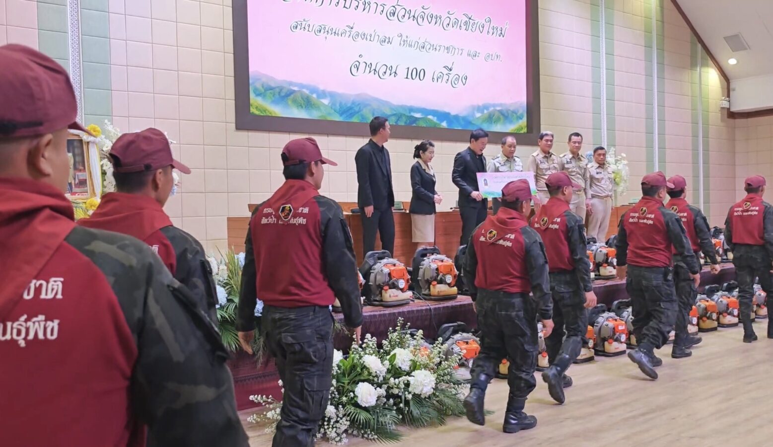 Private sector partners also stepped up, donating 100 leaf blowers for community firebreak work, along with accident insurance policies worth over 500,000 baht for volunteer firefighters — a reminder that the people holding the leaf blowers are doing so without a government salary.
