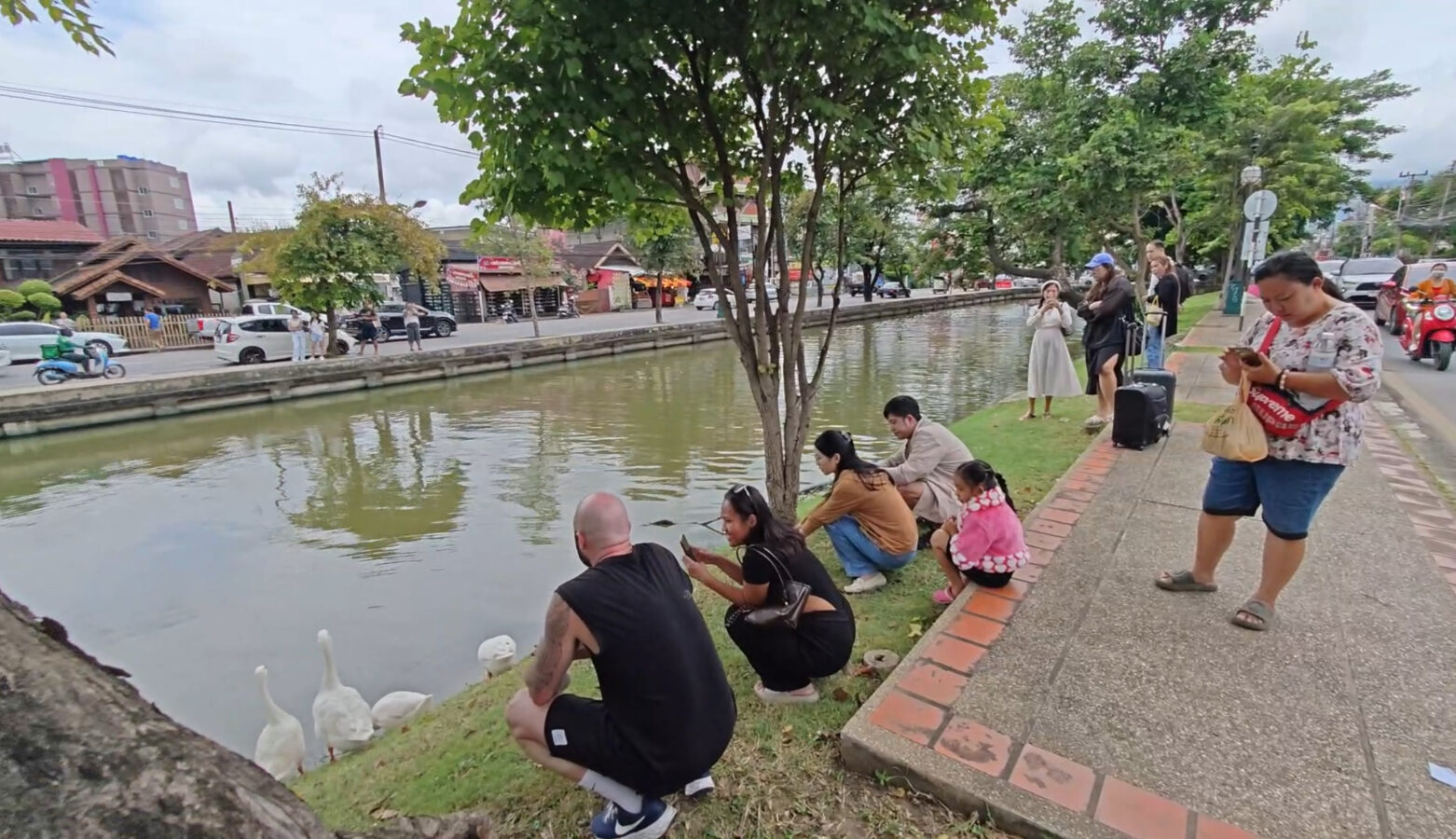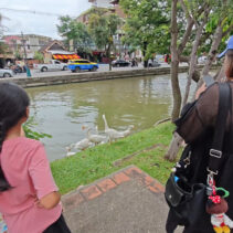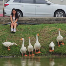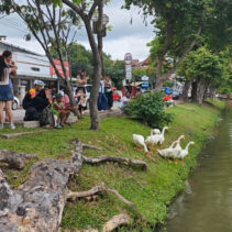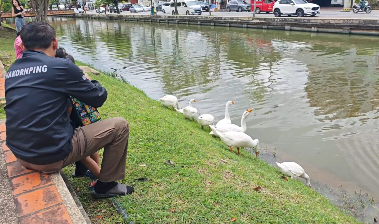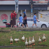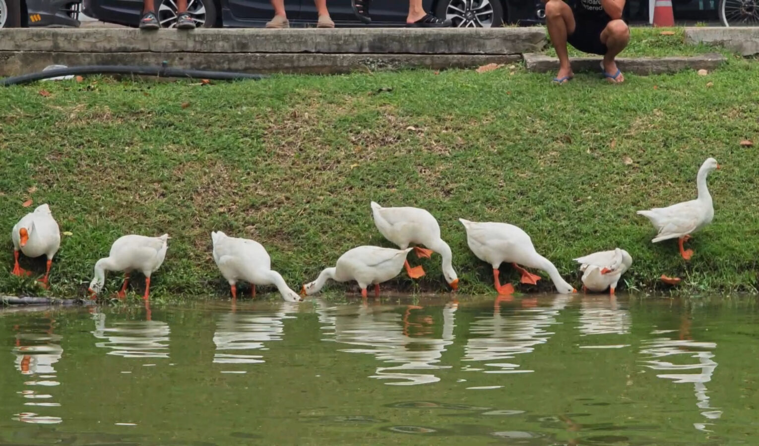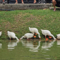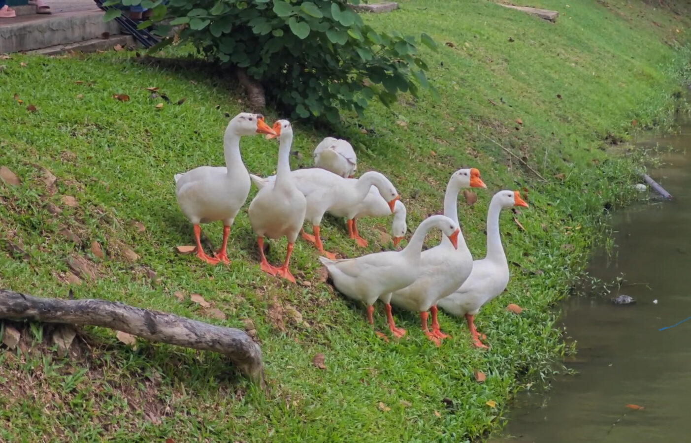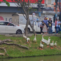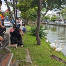Day three is almost over and the ten geese released into the moat three days ago continue to draw big love from the public. Whether or not they are being effective in cleaning up the water weeds and improving water quality of the moat appears to be irrelevant as tourists and locals flock to visit and take photographs of the geese.