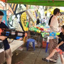 This afternoon, Moon Muang Toad by Tha Pae Gate was already busy with residents and visitors riding and walking along the route, water pistols at the ready. The area is an established landmark for Songkran merrymaking and features a water tunnel that drenches passers-by for relief from the heat. Come nightfall, live music and lighting displays transform the spot further, drawing in those looking to celebrate into the small hours.