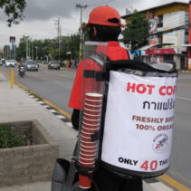 Rocket Man has spotted this little gap in the Chiang Mai coffee market and is now delivering 40 baht coffees, served right to your car window.