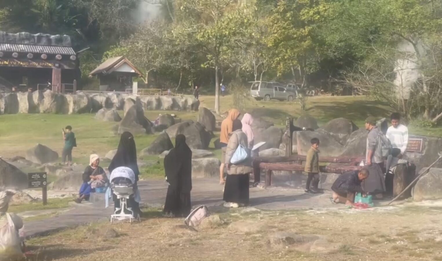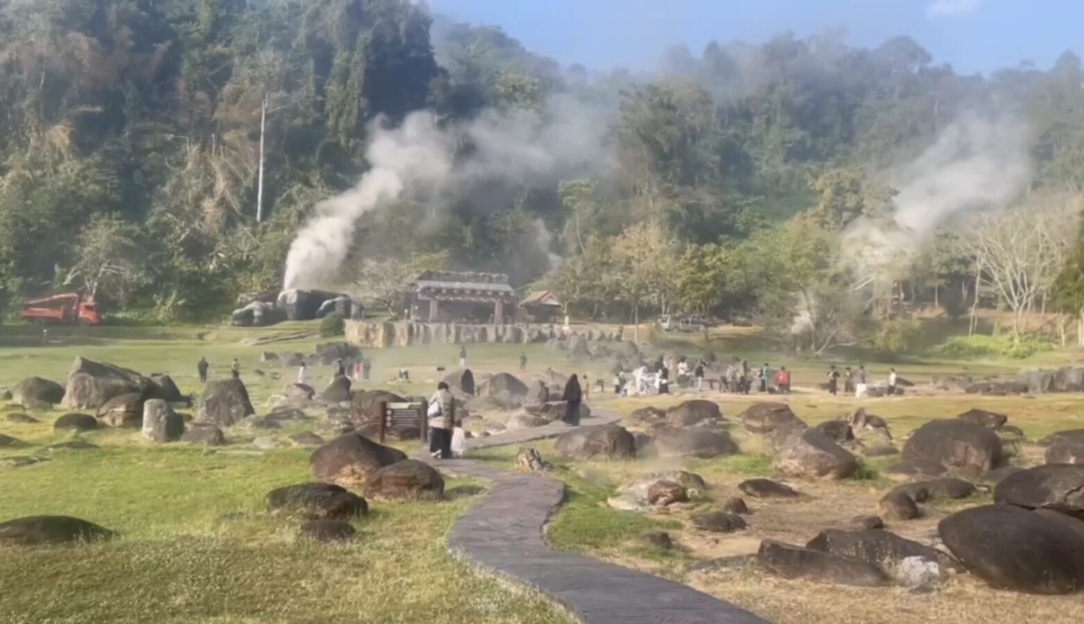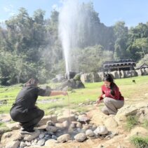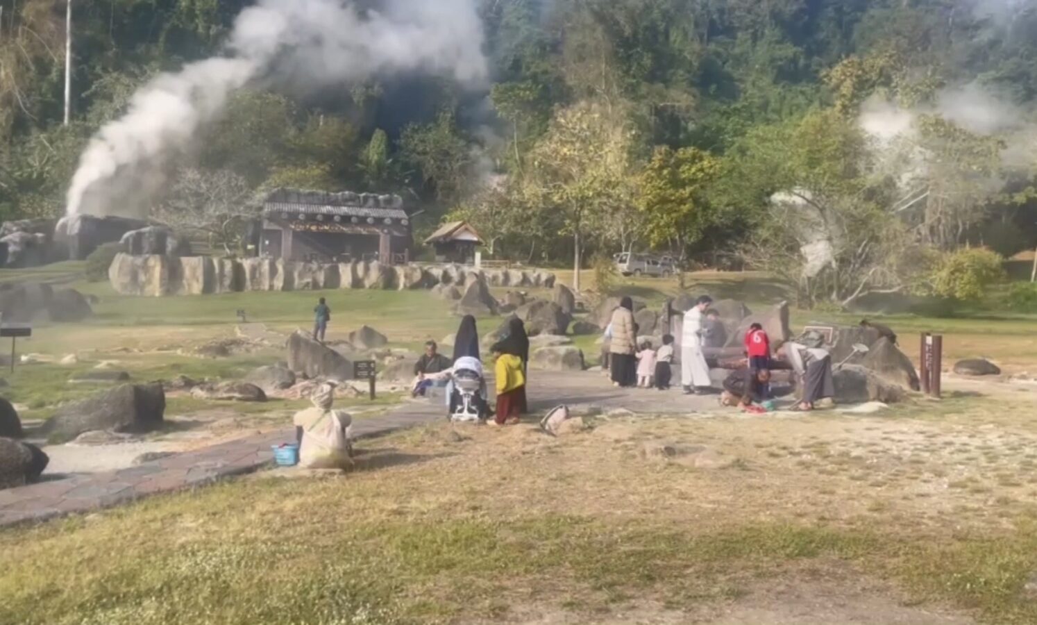 The hot springs span more than 10 rai and feature several natural pools with water temperatures ranging from 50 to 87 degrees Celsius. In some areas, steam rises high, creating a striking geothermal landscape surrounded by forested hills.
