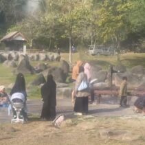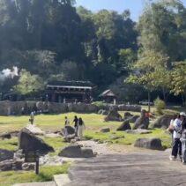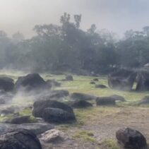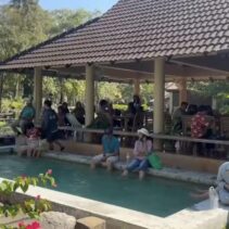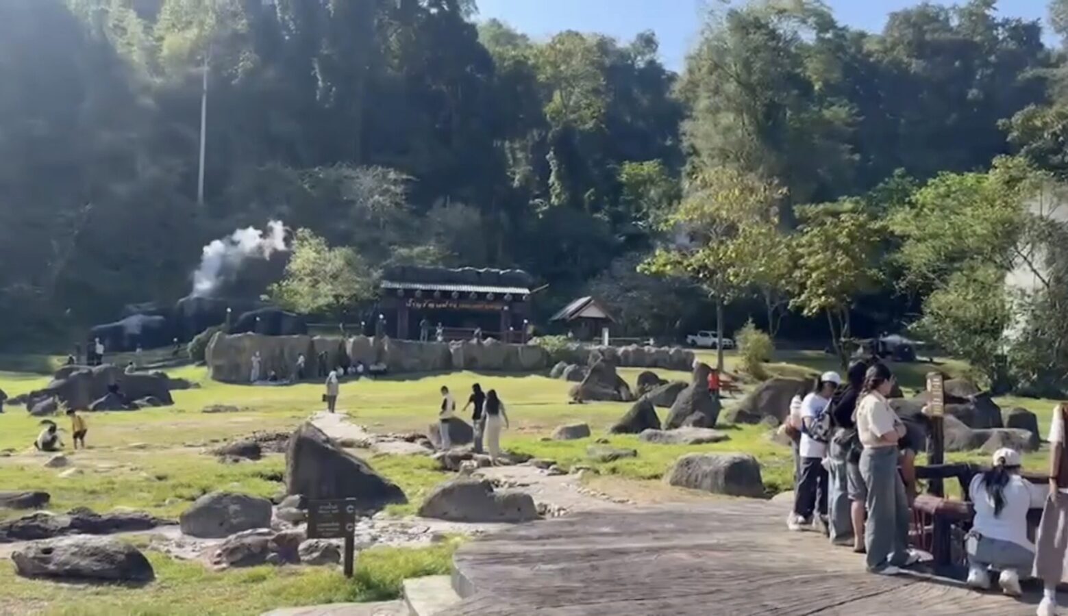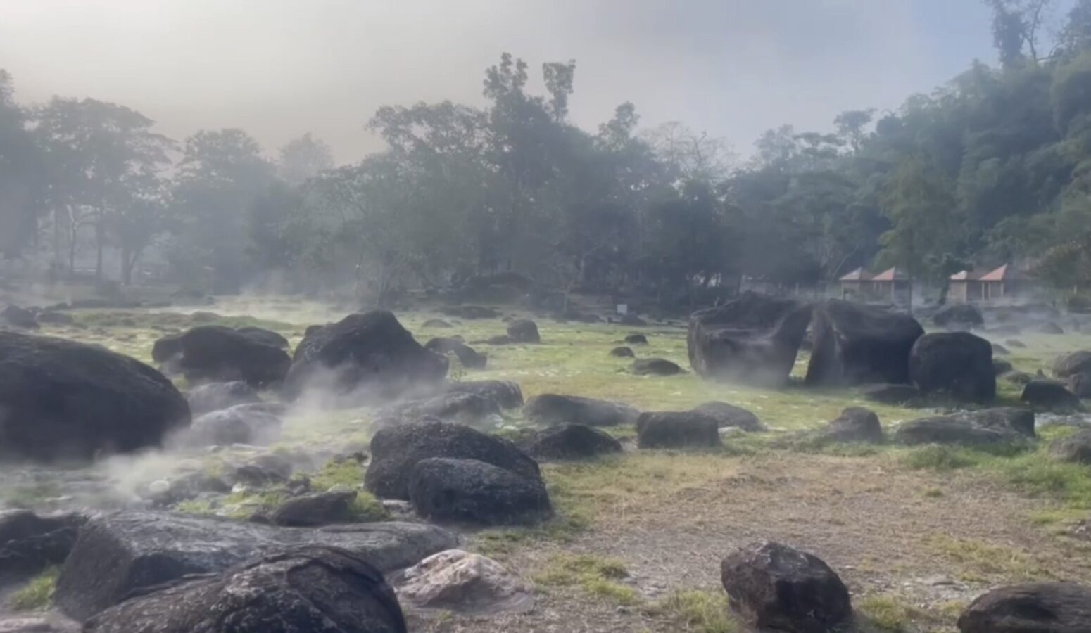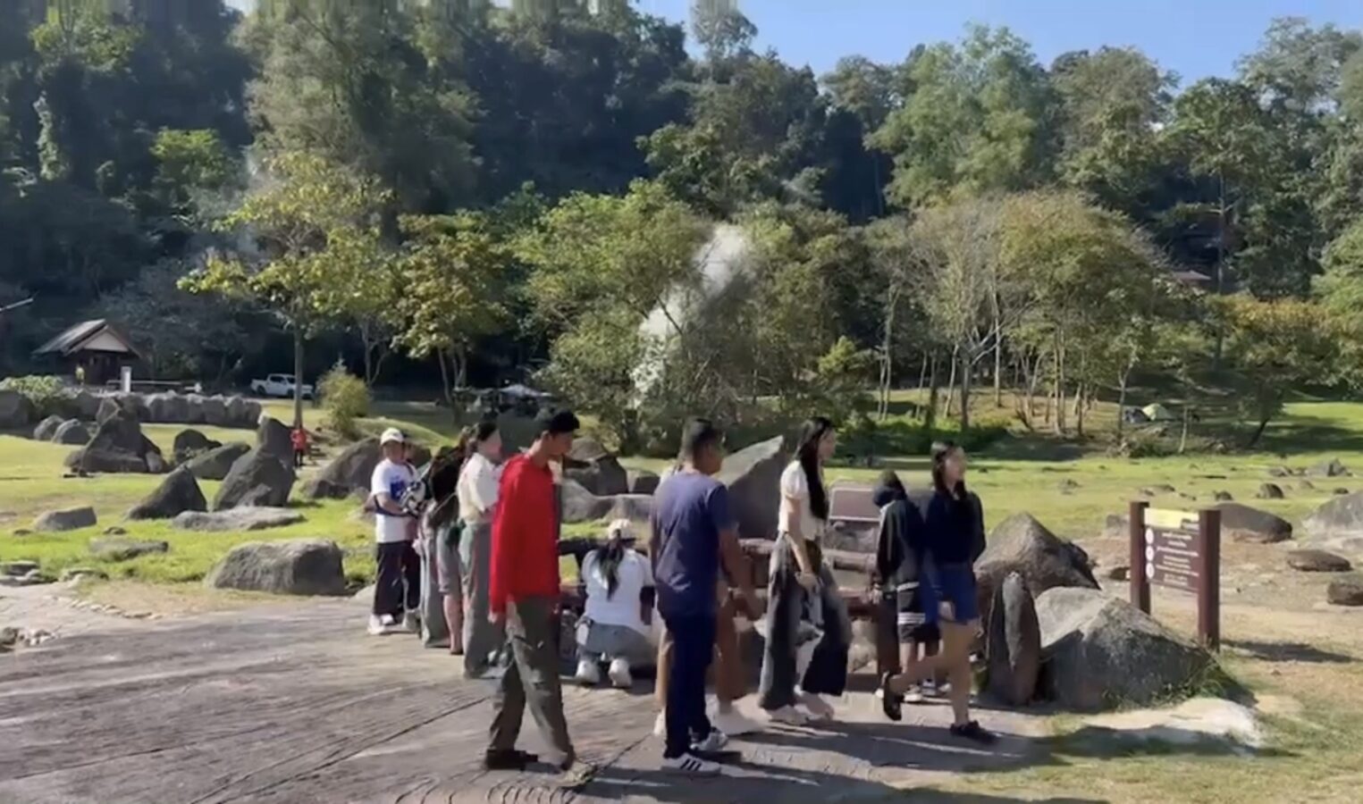 The hot springs span more than 10 rai and feature several natural pools with water temperatures ranging from 50 to 87 degrees Celsius. In some areas, steam rises high, creating a striking geothermal landscape surrounded by forested hills.