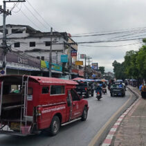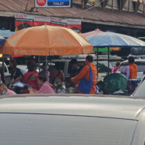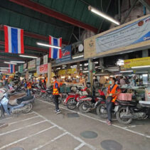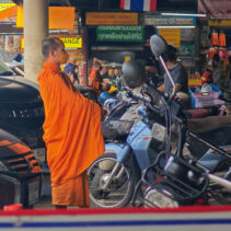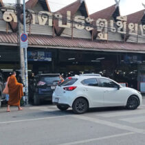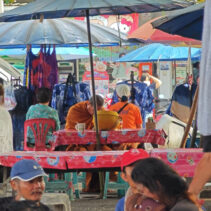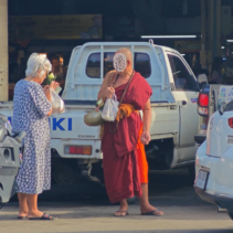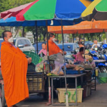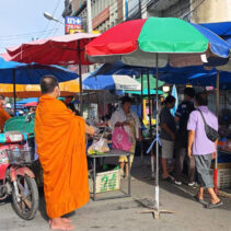 In the early morning at Chiang Mai Gate Market, Buddhist monks can be seen standing and waiting for people to offer them food, instead of walking on alms rounds as is customary. Each monk remains in place until his alms bowl is full, then transfers the food into a bag and continues standing until late.