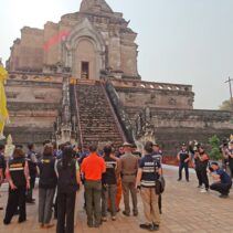 Following Governor Nirat Pongsittithavorn’s inspection of the city today, it has been reported that while there are some visible cracks to the white pagoda at Wat Chedi Luang, as well as to its viharn, all damages are to the recent plaster and not to the foundation of these structures. The governor will discuss with the temple and the Fine Arts Department as to how to repair the damage.