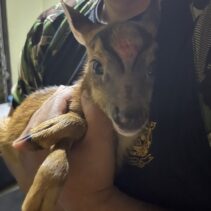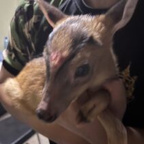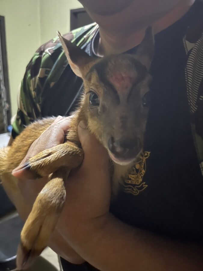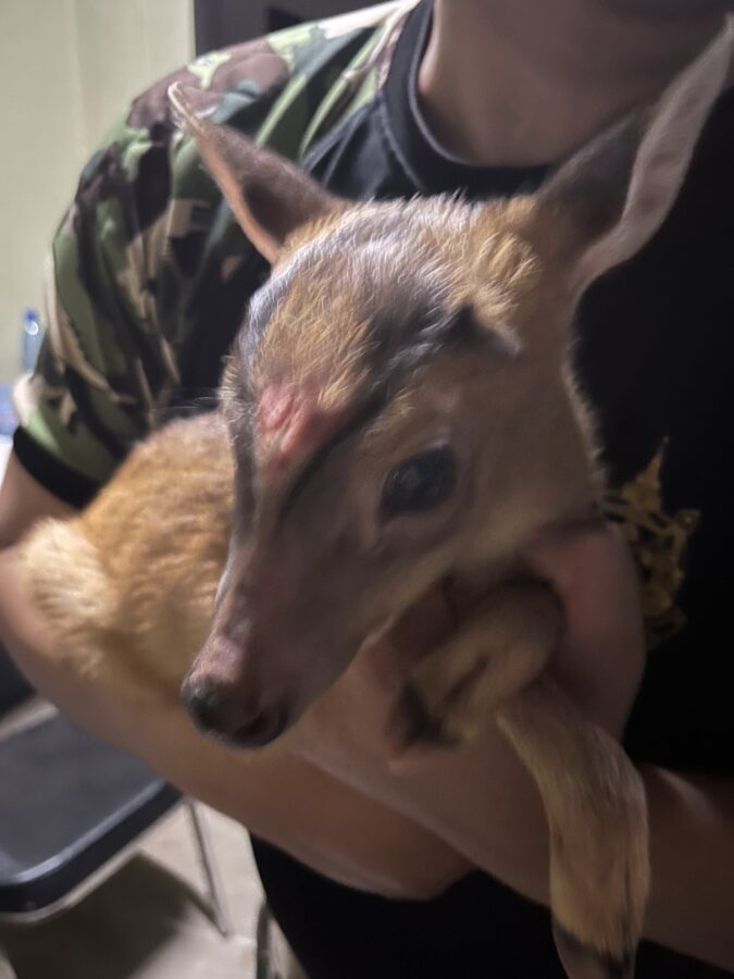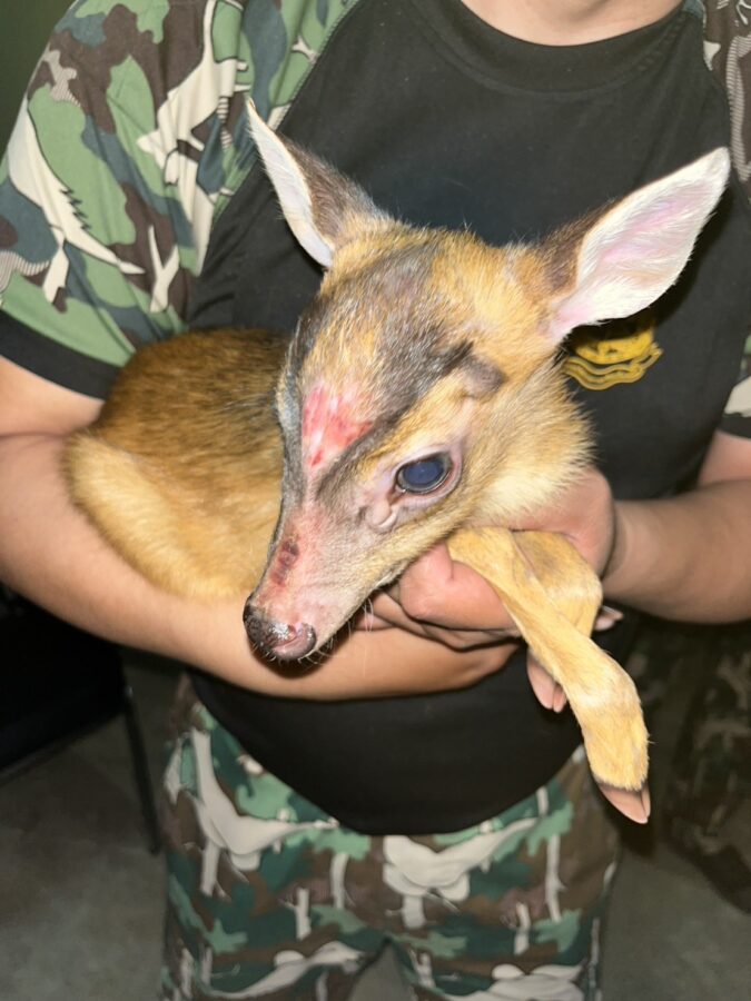 Villagers in Thung Khao Phuang subdistrict, Chiang Dao district, have rescued a young barking deer found collapsed near the Ban Mae Cha community after fleeing wildfires burning through Pha Daeng National Park. The animal was visibly exhausted and had a wound on its forehead, believed to have been sustained while fleeing the flames.