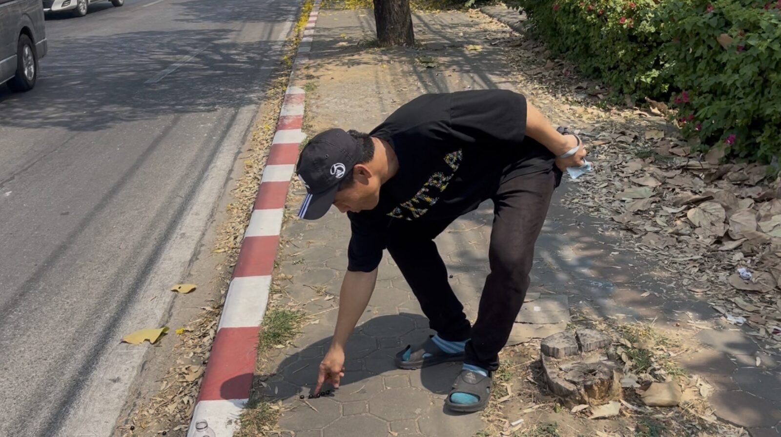 “At first I thought they were kicking a dog that had run into the road, but when I looked more closely I realised they were kicking a person,” Thawatchai told local media, showing his video footage of the incident and walking reporters through the scene, where a broken black prayer-bead bracelet believed to belong to the victim was still lying scattered on the ground.