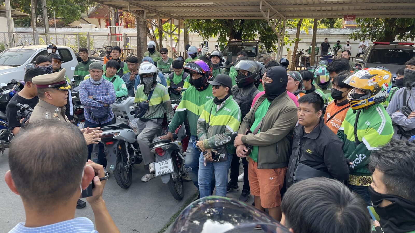 The case also drew a large show of solidarity from Chiang Mai’s delivery-rider community. Hundreds of riders gathered outside Mueang Chiang Mai Police Station later in the afternoon to monitor proceedings, many voicing concern that the suspects might evade prosecution or receive assistance from persons of influence. After a couple of hours, Police Colonel Prachya Thisala, superintendent of Mueang Chiang Mai Police Station, came out to address and reassure the crowd, and the group eventually dispersed.