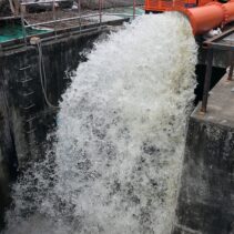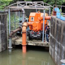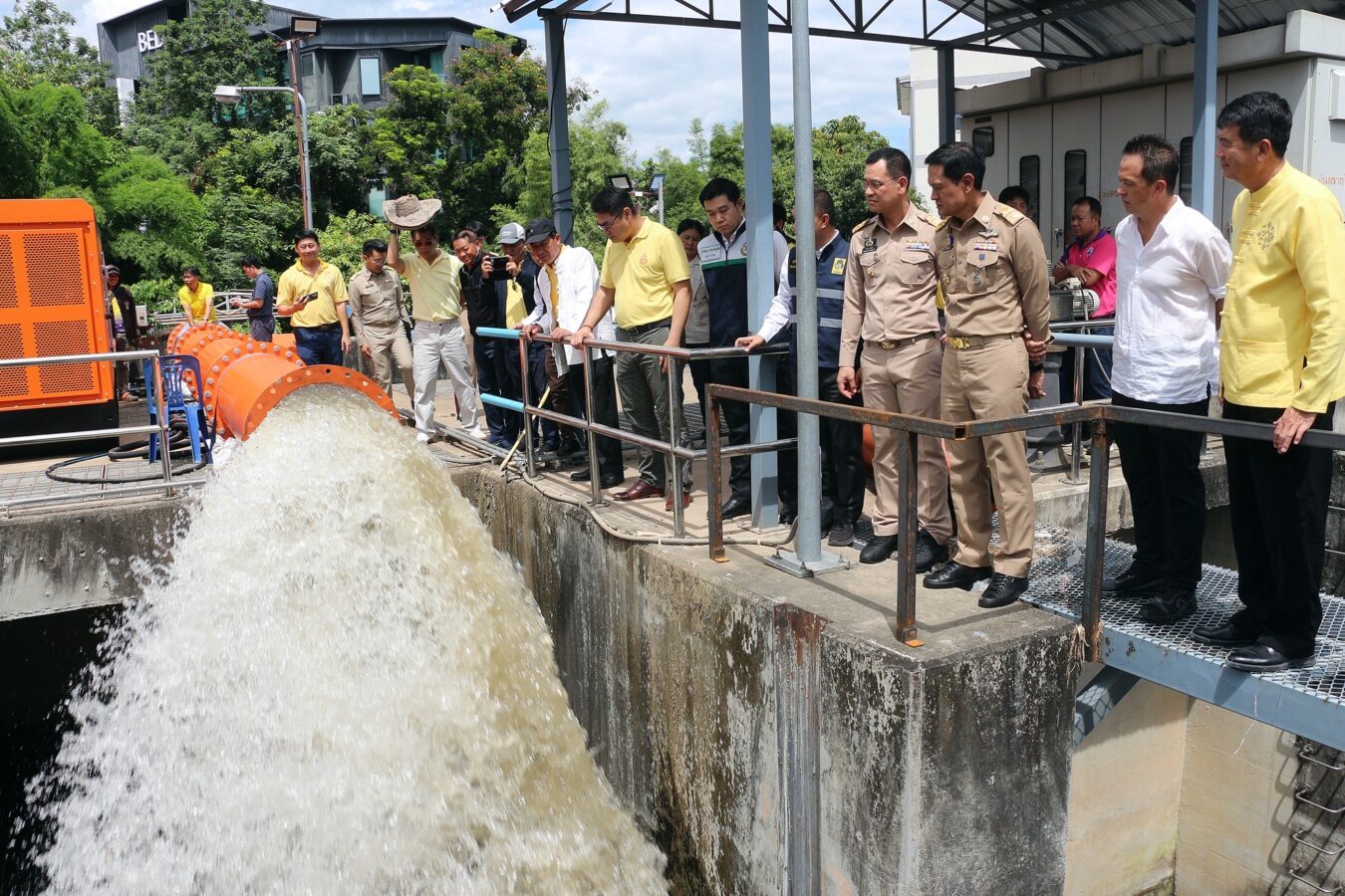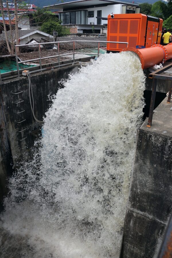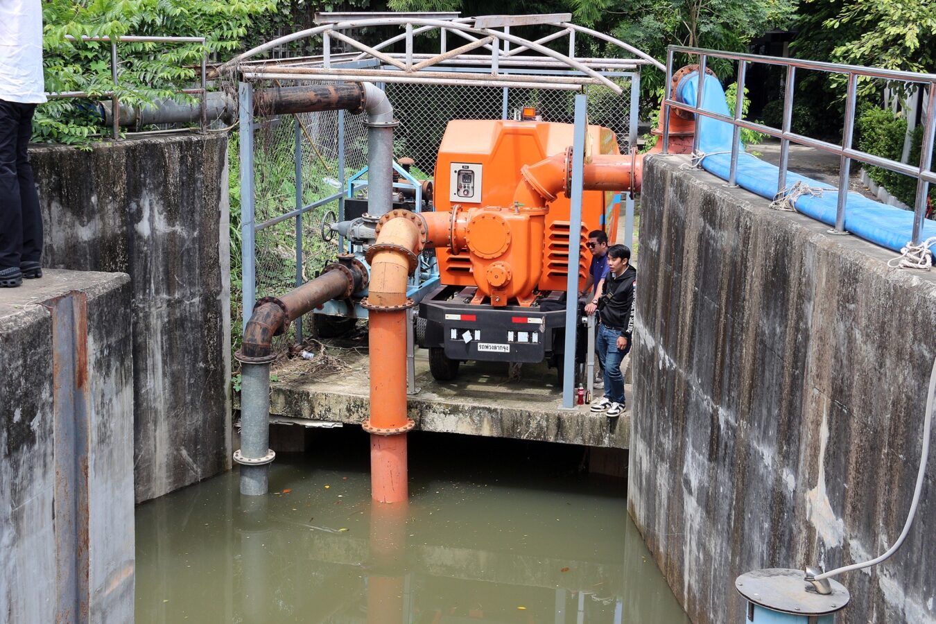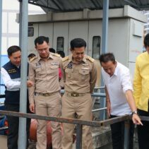 The new hydraulic diesel-powered mobile water pump is worth over 10 million baht and is capable of draining 1.5 cubic metres per second. Together with two existing electric pumps and two temporary ones provided by other agencies, the total drainage capacity now reaches around six cubic metres per second.