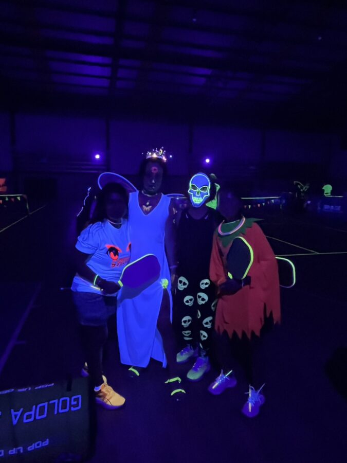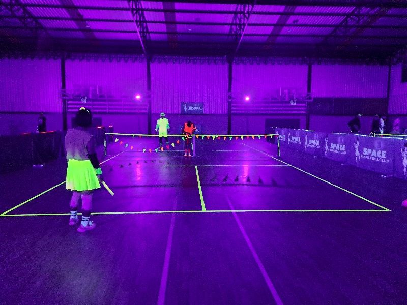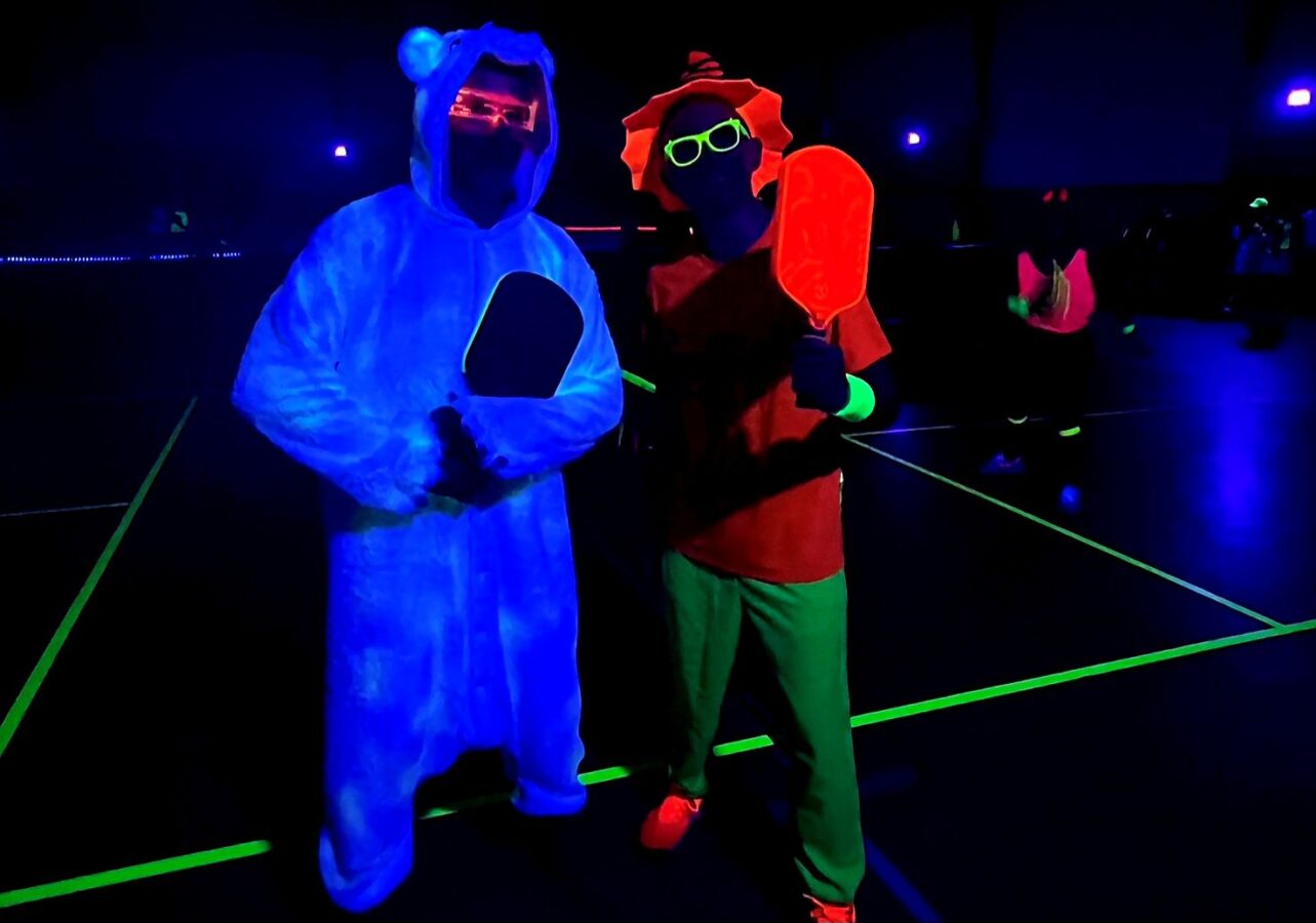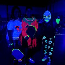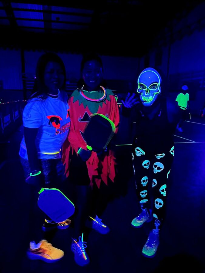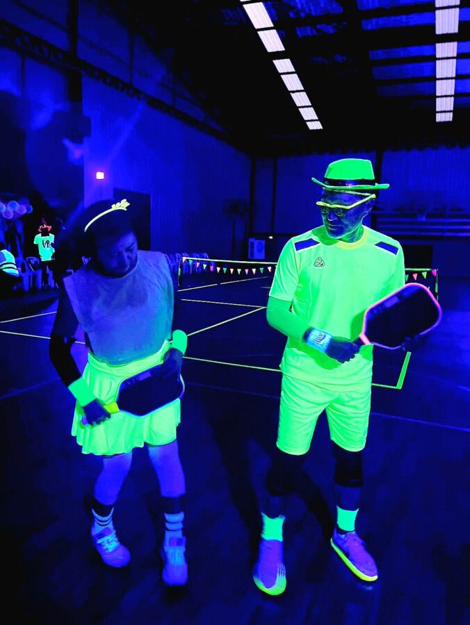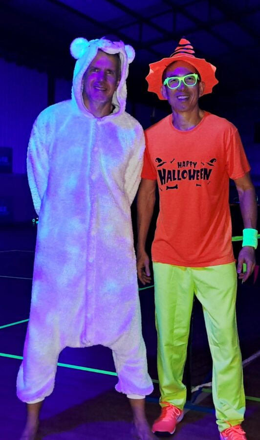 Glow-in-the-Dark Pickleball is played in a darkened hall, with fluorescent court lines, nets, balls and paddles, which are lit by UV lights strung around the hall. Players wear neon outfits and costumes which react to the UV light. This Halloween event was attended by more than 40 players, partners and children, and accompanied by music, food, drinks and a best-dressed competition, and plenty of glow in the dark pickleballing!