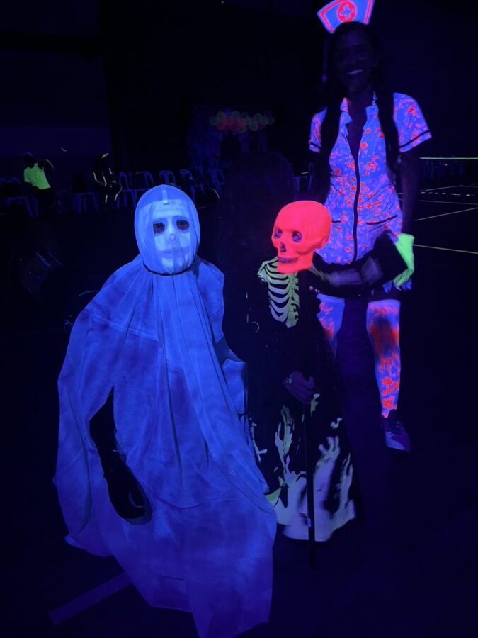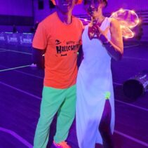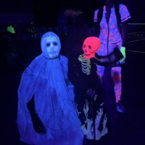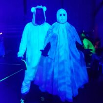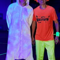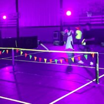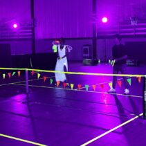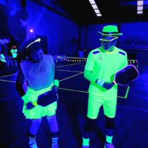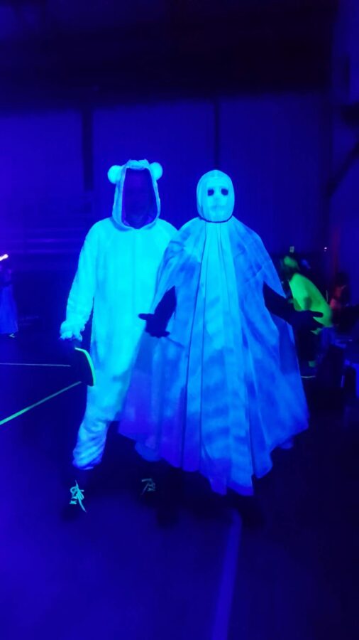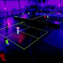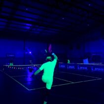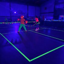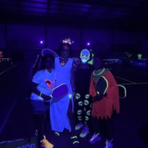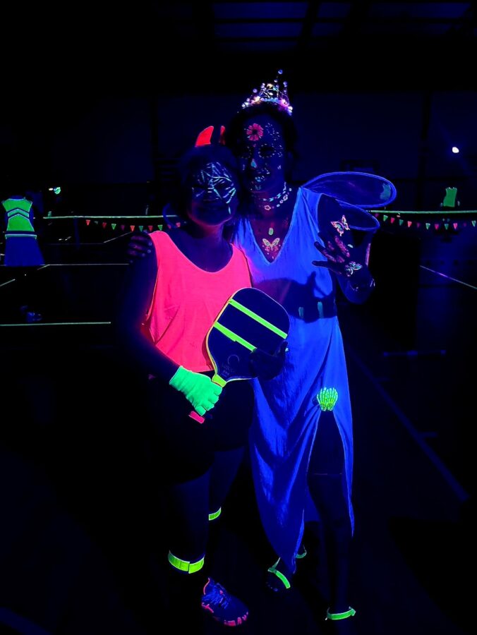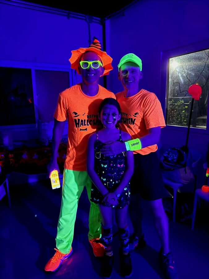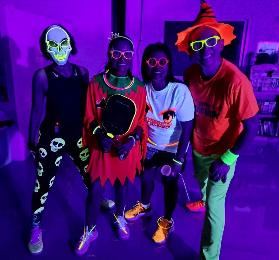 Glow-in-the-Dark Pickleball is played in a darkened hall, with fluorescent court lines, nets, balls and paddles, which are lit by UV lights strung around the hall. Players wear neon outfits and costumes which react to the UV light. This Halloween event was attended by more than 40 players, partners and children, and accompanied by music, food, drinks and a best-dressed competition, and plenty of glow in the dark pickleballing!