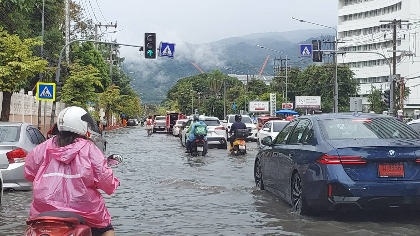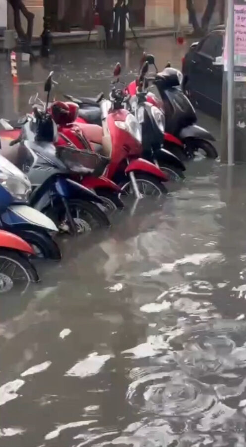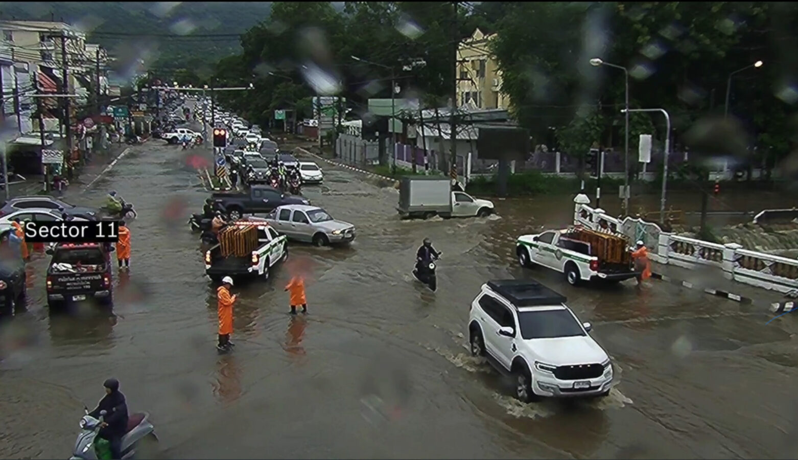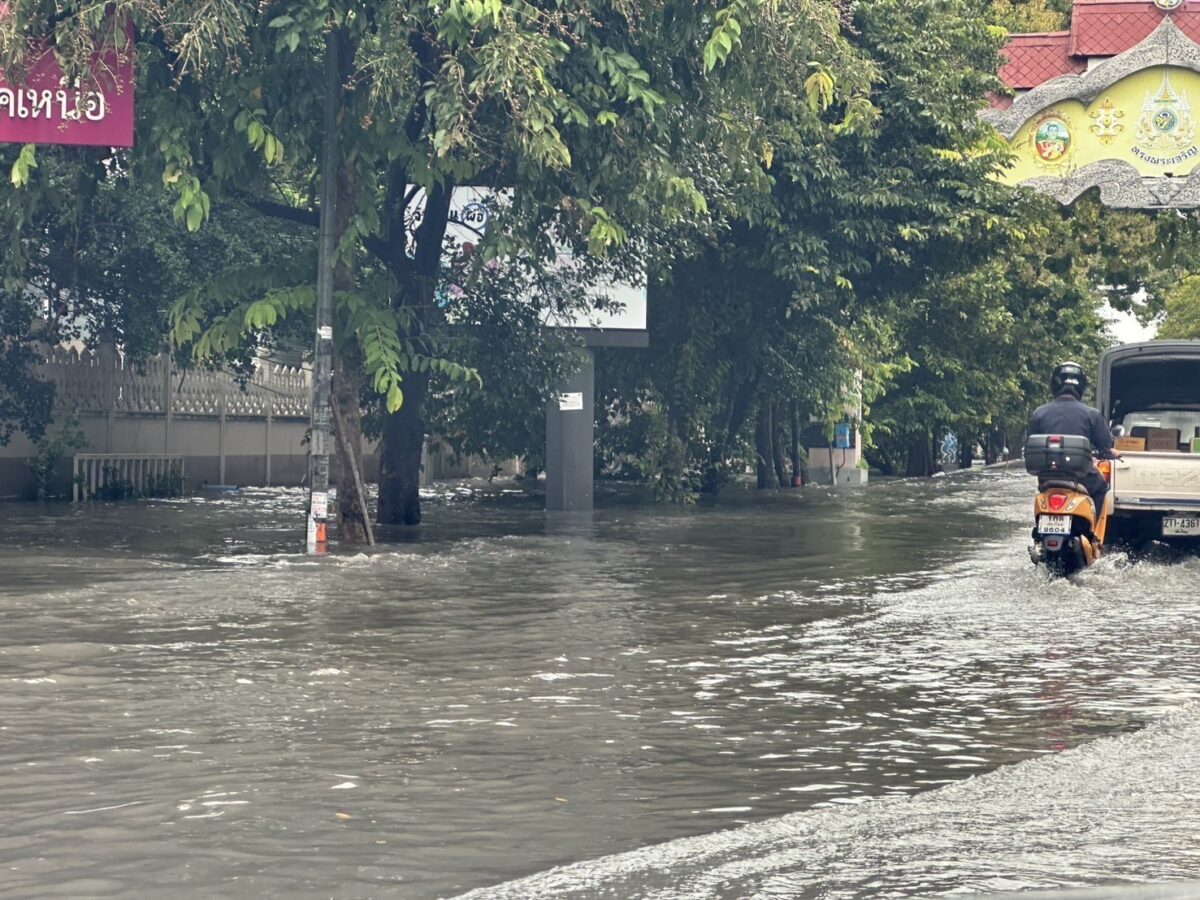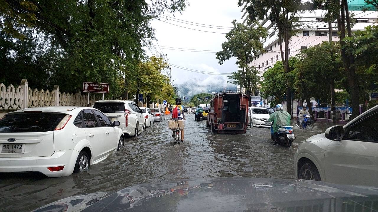 Heavy rains around noon today so many Chiang Mai roads unable to drain enough eater to prevent temporary floodings.