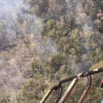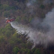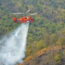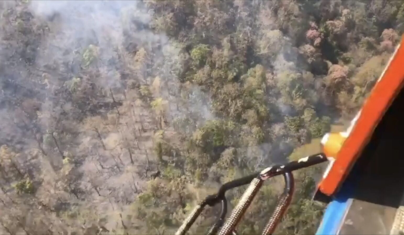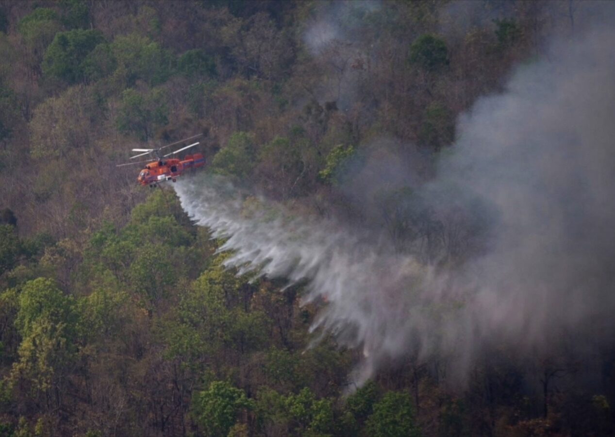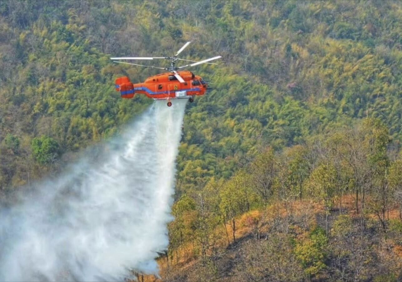To support firefighting operations, the Department of Disaster Prevention and Mitigation deployed a KA-32 helicopter, along with helicopter TS 5120 from the Ministry of Natural Resources and Environment, to conduct aerial water drops throughout the day. The aircraft assisted ground teams battling the fires amid intense heat.