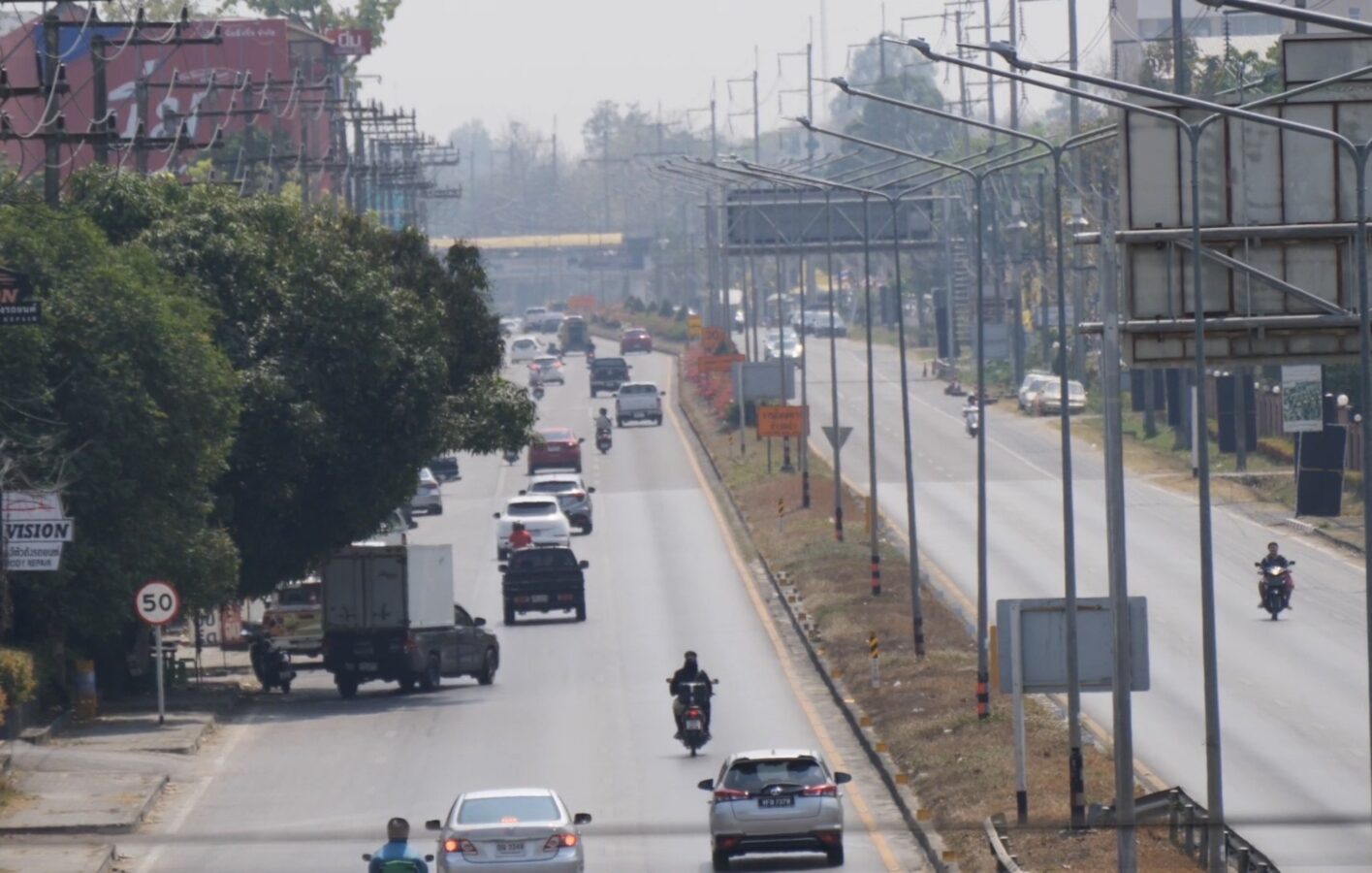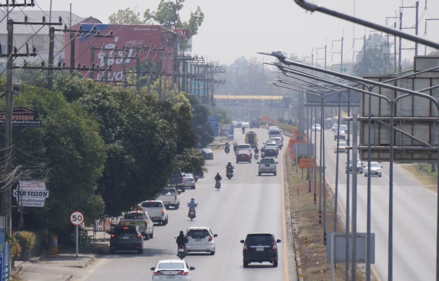 The large number of wildfire hotspots has significantly worsened air quality in Chiang Mai, with the city now blanketed in a thick haze. From the city centre, Doi Suthep has become increasingly faint, while road visibility has also declined.