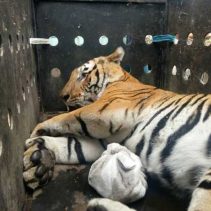 Veterinarians from the Department of National Parks, Wildlife and Plant Conservation shot the tiger with anesthetic then moved it to a cage. The male tiger was measured at 1.2 metres height, 1.6 metres long and was around 200 kilograms in weight. It had an injured wound which appeared to have been a gunshot under its left lips and many more wounds on its body.