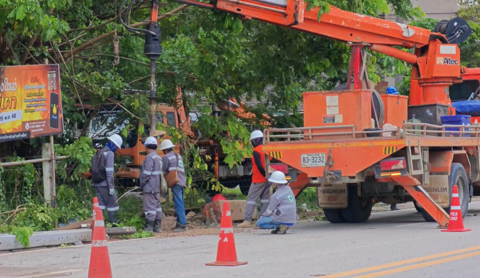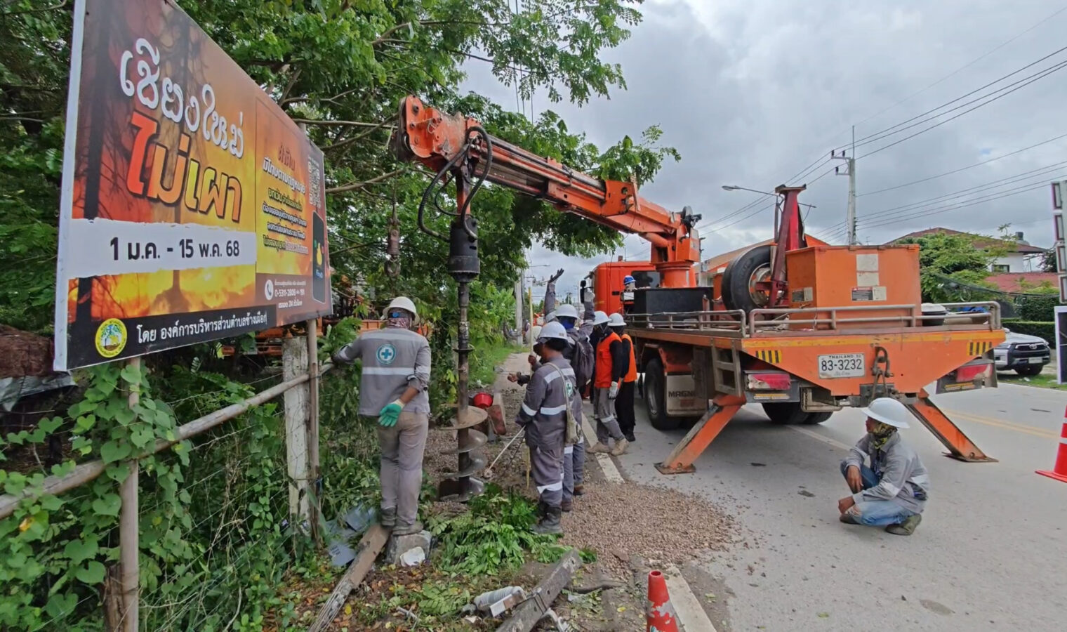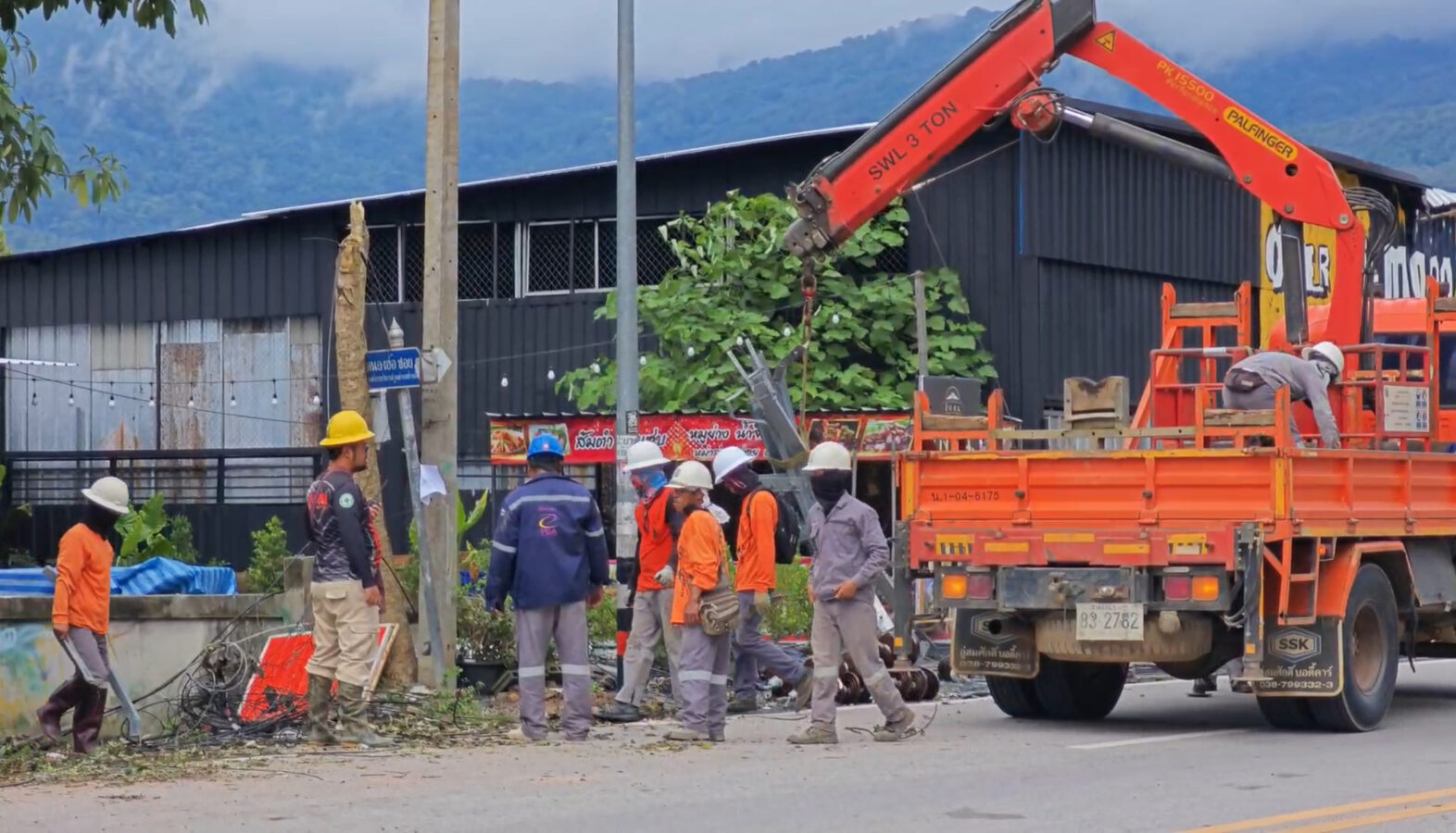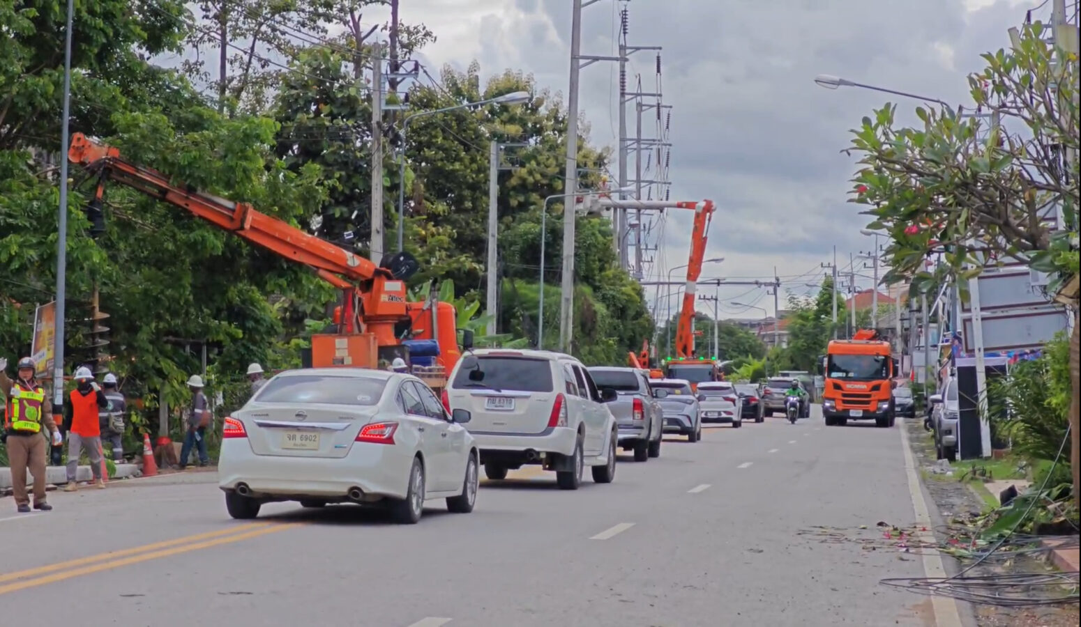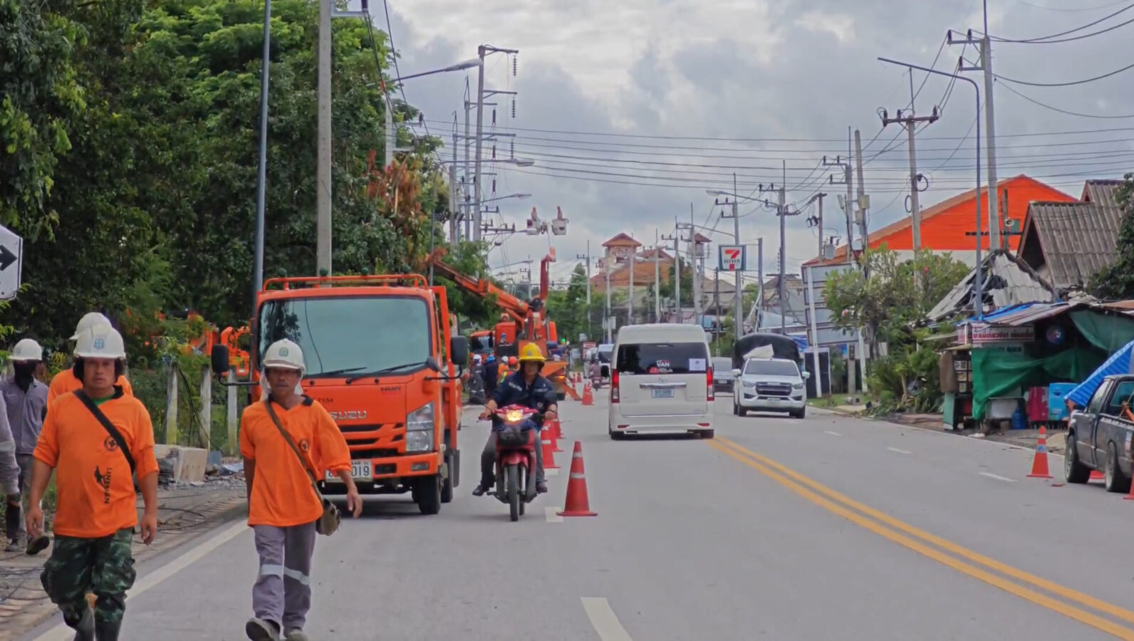 Provincial Electricity Authority officials continue to restore the power system on Nong Ho Road. They are preparing to replace electric poles along the 595-meter route, and the project is expected to take three days to complete. Power has already been restored to all affected households.